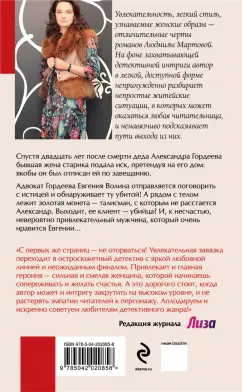 ОписаниеСпустя двадцать лет после смерти деда Александра Гордеева бывшая жена старика подала иск, претендуя на его дом: якобы он был отписан ей по завещанию. Адвокат Гордеева Евгения Волина отправляется поговорить с истицей и обнаруживает ту убитой! А рядом с телом лежит золотая монета - талисман, с которым не расстается Александр. Выходит, ее клиент - убийца? И, к несчастью, невероятно привлекательный мужчина, который очень нравится Евгении… Людмила Мартова - мастер увлекательной детективной мелодрамы, автор захватывающих остросюжетных историй. Их отличают закрученная интрига, лихой финал с неожиданной развязкой и, конечно же, яркая любовная линия. Героини романов Людмилы Мартовой - современные молодые женщины, которые точно знают, чего хотят от жизни.Спустя двадцать лет после смерти деда Александра Гордеева бывшая жена старика подала иск, претендуя на его дом: якобы он был отписан ей по завещанию. Адвокат Гордеева Евгения Волина отправляется поговорить с истицей и обнаруживает ту убитой! А рядом с телом лежит золотая монета - талисман, с которым не расстается Александр. Выходит, ее клиент - убийца? И, к несчастью, невероятно привлекательный мужчина, который очень нравится Евгении… Людмила Мартова - мастер увлекательной детективной мелодрамы, автор захватывающих остросюжетных историй. Их отличают закрученная интрига, лихой финал с неожиданной развязкой и, конечно же, яркая любовная линия. Героини романов Людмилы Мартовой - современные молодые женщины, которые точно знают, чего хотят от жизни.