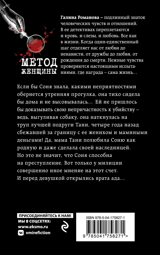 ОписаниеЕсли бы Соня знала, какими неприятностями обернется утренняя прогулка, она тихо сидела бы дома и не высовывалась… Ей не пришлось бы доказывать свою непричастность к убийству - ведь, выгуливая собаку, она наткнулась на труп лучшей подруги Тани, четыре года назад сбежавшей за границу с ее женихом и мамиными деньгами! Да, мама Тани полюбила Соню как родную и даже сделала своей наследницей. Но это не значит, что Соня способна на преступление. Вот только у милиции совершенно иное мнение на этот счет. И перед девушкой открылись врата ада…В детективных мелодрамах Галины Романовой переплелись и кровь, и слезы, и любовь. Все, как в жизни! Нежные чувства проверяются настоящими испытаниями, где награда - сама жизнь. Каждая история по-своему уникальна и не кажется вымыслом! И все они объединены общей темой: настоящая любовь всегда побеждает, а за преступлением непременно следует наказание.Если бы Соня знала, какими неприятностями обернется утренняя прогулка, она тихо сидела бы дома и не высовывалась… Ей не пришлось бы доказывать свою непричастность к убийству - ведь, выгуливая собаку, она наткнулась на труп лучшей подруги Тани, четыре года назад сбежавшей за границу с ее женихом и мамиными деньгами! Да, мама Тани полюбила Соню как родную и даже сделала своей наследницей. Но это не значит, что Соня способна на преступление. Вот только у милиции совершенно иное мнение на этот счет. И перед девушкой открылись врата ада…В детективных мелодрамах Галины Романовой переплелись и кровь, и слезы, и любовь. Все, как в жизни! Нежные чувства проверяются настоящими испытаниями, где награда - сама жизнь. Каждая история по-своему уникальна и не кажется вымыслом! И все они объединены общей темой: настоящая любовь всегда побеждает, а за преступлением непременно следует наказание.