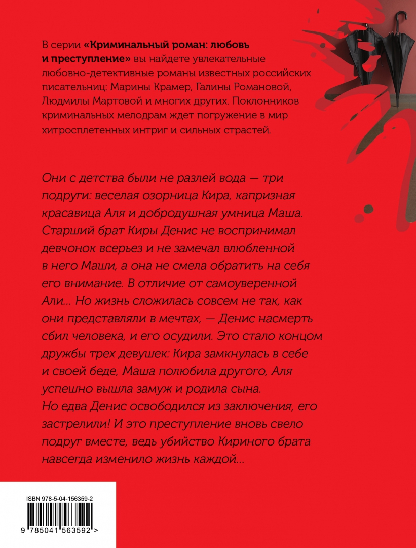 ОписаниеОни с детства были не разлей вода - три подруги: веселая озорница Кира, капризная красавица Аля и добродушная умница Маша. Старший брат Киры Денис не воспринимал девчонок всерьез и не замечал влюбленной в него Маши, а она не смела обратить на себя его внимание. В отличие от самоуверенной Али… Но жизнь сложилась совсем не так, как они представляли в мечтах, - Денис насмерть сбил человека, и его осудили. Это стало концом дружбы трех девушек: Кира замкнулась в себе и своей беде, Маша полюбила другого, Аля успешно вышла замуж и родила сына. Но едва Денис освободился из заключения, его застрелили! И это преступление вновь свело подруг вместе, ведь убийство Кириного брата навсегда изменило жизнь каждой… Татьяна Устинова рекомендует: "Удивительно, но в книгах Евгении Горской угадывается настроение больших русских романов. Она умещает в детектив современную энциклопедию разнообразнейших губительных страстей, созидательных любовей и ярких, живых, разноголосых героев. Получается не только интересно и зажигательно, но еще и очень по-настоящему - ровно настолько, чтобы захотелось поверить в эту историю. Горская ловко и умеючи держит читателя в напряжении: тебе иногда страшно, иногда смешно, иногда будто бы совсем безнадежно, но в конечном итоге понимаешь: все будет хорошо!"СвернутьОни с детства были не разлей вода - три подруги: веселая озорница Кира, капризная красавица Аля и добродушная умница Маша. Старший брат Киры Денис не воспринимал девчонок всерьез и не замечал влюбленной в него Маши, а она не смела обратить на себя его внимание. В отличие от самоуверенной Али… Но жизнь сложилась совсем не так, как они представляли в мечтах, - Денис насмерть сбил человека, и его осудили. Это стало концом дружбы трех девушек: Кира замкнулась в себе и своей беде, Маша полюбила другого, Аля успешно вышла замуж и родила сына. Но едва Денис освободился из заключения, его застрелили! И это преступление вновь свело подруг вместе, ведь убийство Кириного брата навсегда изменило жизнь каждой… Татьяна Устинова рекомендует: "Удивительно, но в книгах Евгении Горской угадывается настроение больших русских романов. Она умещает в детектив современную энциклопедию разнообразнейших губительных страстей, созидательных любовей и ярких, живых, разноголосых героев. Получается не только интересно и зажигательно, но еще и очень по-настоящему - ровно настолько, чтобы захотелось поверить в эту историю. Горская ловко и умеючи держит читателя в напряжении: тебе иногда страшно, иногда смешно, иногда будто бы совсем безнадежно, но в конечном итоге понимаешь: все будет хорошо!"СвернутьСвернуть