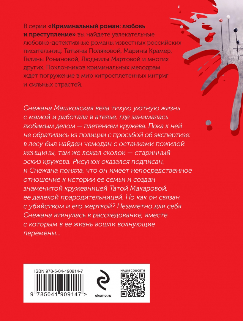 ОписаниеСнежана Машковская вела тихую уютную жизнь с мамой и работала в ателье, где занималась любимым делом — плетением кружева. Пока к ней не обратились из полиции с просьбой об экспертизе: в лесу был найден чемодан с останками пожилой женщины, там же лежал сколок — старинный эскиз кружева. Рисунок оказался подписан, и Снежана поняла, что он имеет непосредственное отношение к истории ее семьи и создан знаменитой кружевницей Татой Макаровой, ее далекой прародительницей. Но как он связан с убийством и его жертвой? Незаметно для себя Снежана втянулась в расследование, вместе с которым в ее жизнь вошли волнующие перемены… Увлекательные любовно-детективные романы Людмилы Мартовой мотивируют читательниц на достижение своих целей и заставляют их поверить в то, что они достойны большего. Автор активно занимается самопродвижением, тиражи стабильно растут, поэтому не поверить ей нельзя. Людмила Мартова — пример для каждой из читательниц, как достичь своей мечты.Снежана Машковская вела тихую уютную жизнь с мамой и работала в ателье, где занималась любимым делом — плетением кружева. Пока к ней не обратились из полиции с просьбой об экспертизе: в лесу был найден чемодан с останками пожилой женщины, там же лежал сколок — старинный эскиз кружева. Рисунок оказался подписан, и Снежана поняла, что он имеет непосредственное отношение к истории ее семьи и создан знаменитой кружевницей Татой Макаровой, ее далекой прародительницей. Но как он связан с убийством и его жертвой? Незаметно для себя Снежана втянулась в расследование, вместе с которым в ее жизнь вошли волнующие перемены… Увлекательные любовно-детективные романы Людмилы Мартовой мотивируют читательниц на достижение своих целей и заставляют их поверить в то, что они достойны большего. Автор активно занимается самопродвижением, тиражи стабильно растут, поэтому не поверить ей нельзя. Людмила Мартова — пример для каждой из читательниц, как достичь своей мечты.