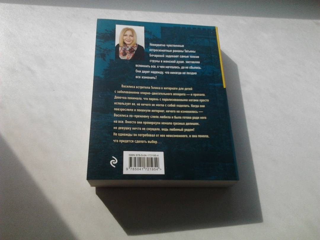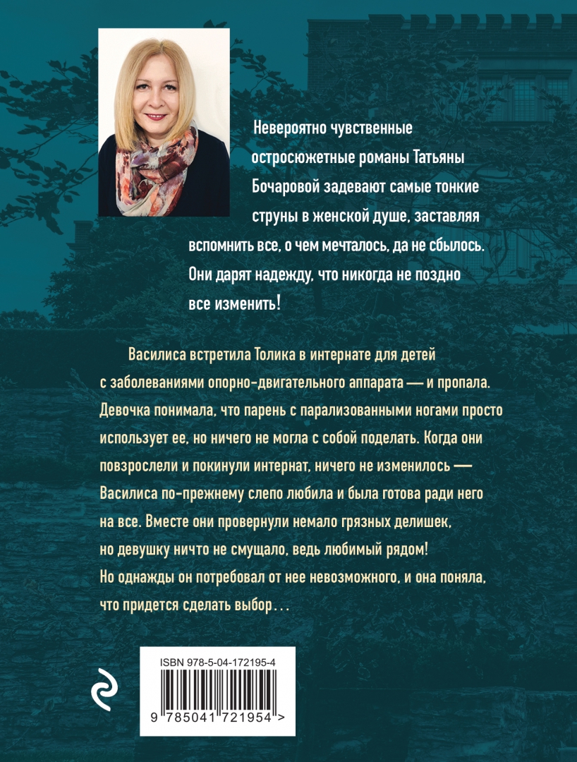 ОписаниеВасилиса встретила Толика в интернате для детей с заболеваниями опорно-двигательного аппарата и пропала. Девочка понимала, что парень с парализованными ногами просто использует ее, но ничего не могла с собой поделать. Когда они повзрослели и покинули интернат, ничего не изменилось - Василиса по-прежнему слепо любила и была готова ради него на все. Вместе они провернули немало грязных делишек, но девушку ничего не смущало, ведь любимый рядом! Но однажды он потребовал от нее невозможного, и она поняла, что придется сделать выбор… В своих романах Татьяна Бочарова синтезирует разные жанры: это и детектив, и мелодрама, и обязательно лирическая история о человеческих чувствах и переживаниях. Ее герои - простые люди, наши с вами современники, которые волею судьбы оказались в сложной ситуации. Им предстоит сделать непростой выбор, разобраться в дебрях козней и обмана, не сломаться, выстоять, помочь не только себе, но и тем, кому необходима их помощь.Василиса встретила Толика в интернате для детей с заболеваниями опорно-двигательного аппарата и пропала. Девочка понимала, что парень с парализованными ногами просто использует ее, но ничего не могла с собой поделать. Когда они повзрослели и покинули интернат, ничего не изменилось - Василиса по-прежнему слепо любила и была готова ради него на все. Вместе они провернули немало грязных делишек, но девушку ничего не смущало, ведь любимый рядом! Но однажды он потребовал от нее невозможного, и она поняла, что придется сделать выбор… В своих романах Татьяна Бочарова синтезирует разные жанры: это и детектив, и мелодрама, и обязательно лирическая история о человеческих чувствах и переживаниях. Ее герои - простые люди, наши с вами современники, которые волею судьбы оказались в сложной ситуации. Им предстоит сделать непростой выбор, разобраться в дебрях козней и обмана, не сломаться, выстоять, помочь не только себе, но и тем, кому необходима их помощь.