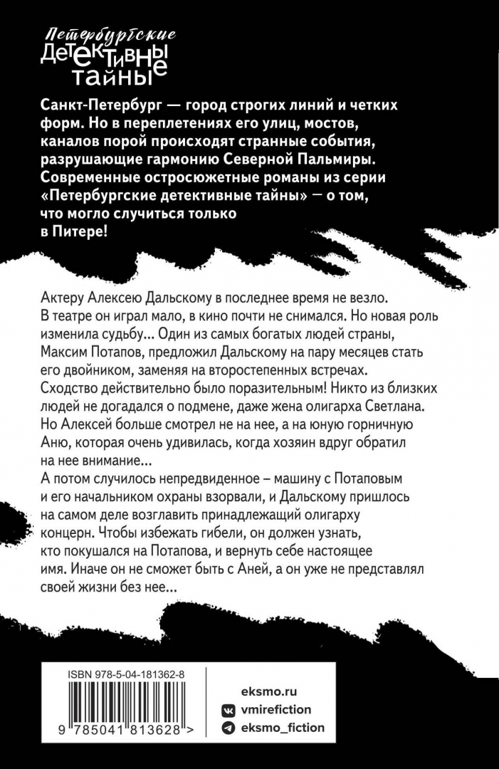 ОписаниеАктеру Алексею Дальскому в последнее время не везло. В театре он играл мало, в кино почти не снимался. Но новая роль изменила судьбу... Один из самых богатых людей страны, Максим Потапов, предложил Дальскому на пару месяцев стать его двойником, заменяя на второстепенных встречах. Сходство действительно было поразительным! Никто из близких людей не догадался о подмене, даже жена олигарха Светлана. Но Алексей больше смотрел не на нее, а на юную горничную Аню, которая очень удивилась, когда хозяин вдруг обратил на нее внимание… А потом случилось непредвиденное - машину с Потаповым и его начальником охраны взорвали, и Дальскому пришлось на самом деле возглавить принадлежащий олигарху концерн. Чтобы избежать гибели, он должен узнать, кто покушался на Потапова, и вернуть себе настоящее имя. Иначе он не сможет быть с Аней, а он уже не представлял своей жизни без нее… Татьяна Устинова рекомендует: "Островская играет жизнями, тасует героев, заставляет их совершать неожиданные и странные поступки, а читателя - с замиранием сердца следить за ними и гадать: сработает, не сработает, выберутся, не выберутся!.. Сюжет то и дело поворачивает в какую-то другую сторону и на полной скорости несется дальше. Это почти невозможно, но ей удается удержаться на этих виражах!.. И очень хочется, чтобы у героев все получилось!.. И финал! Он всегда феерический, во всех отношениях".СвернутьАктеру Алексею Дальскому в последнее время не везло. В театре он играл мало, в кино почти не снимался. Но новая роль изменила судьбу... Один из самых богатых людей страны, Максим Потапов, предложил Дальскому на пару месяцев стать его двойником, заменяя на второстепенных встречах. Сходство действительно было поразительным! Никто из близких людей не догадался о подмене, даже жена олигарха Светлана. Но Алексей больше смотрел не на нее, а на юную горничную Аню, которая очень удивилась, когда хозяин вдруг обратил на нее внимание… А потом случилось непредвиденное - машину с Потаповым и его начальником охраны взорвали, и Дальскому пришлось на самом деле возглавить принадлежащий олигарху концерн. Чтобы избежать гибели, он должен узнать, кто покушался на Потапова, и вернуть себе настоящее имя. Иначе он не сможет быть с Аней, а он уже не представлял своей жизни без нее… Татьяна Устинова рекомендует: "Островская играет жизнями, тасует героев, заставляет их совершать неожиданные и странные поступки, а читателя - с замиранием сердца следить за ними и гадать: сработает, не сработает, выберутся, не выберутся!.. Сюжет то и дело поворачивает в какую-то другую сторону и на полной скорости несется дальше. Это почти невозможно, но ей удается удержаться на этих виражах!.. И очень хочется, чтобы у героев все получилось!.. И финал! Он всегда феерический, во всех отношениях".СвернутьСвернуть