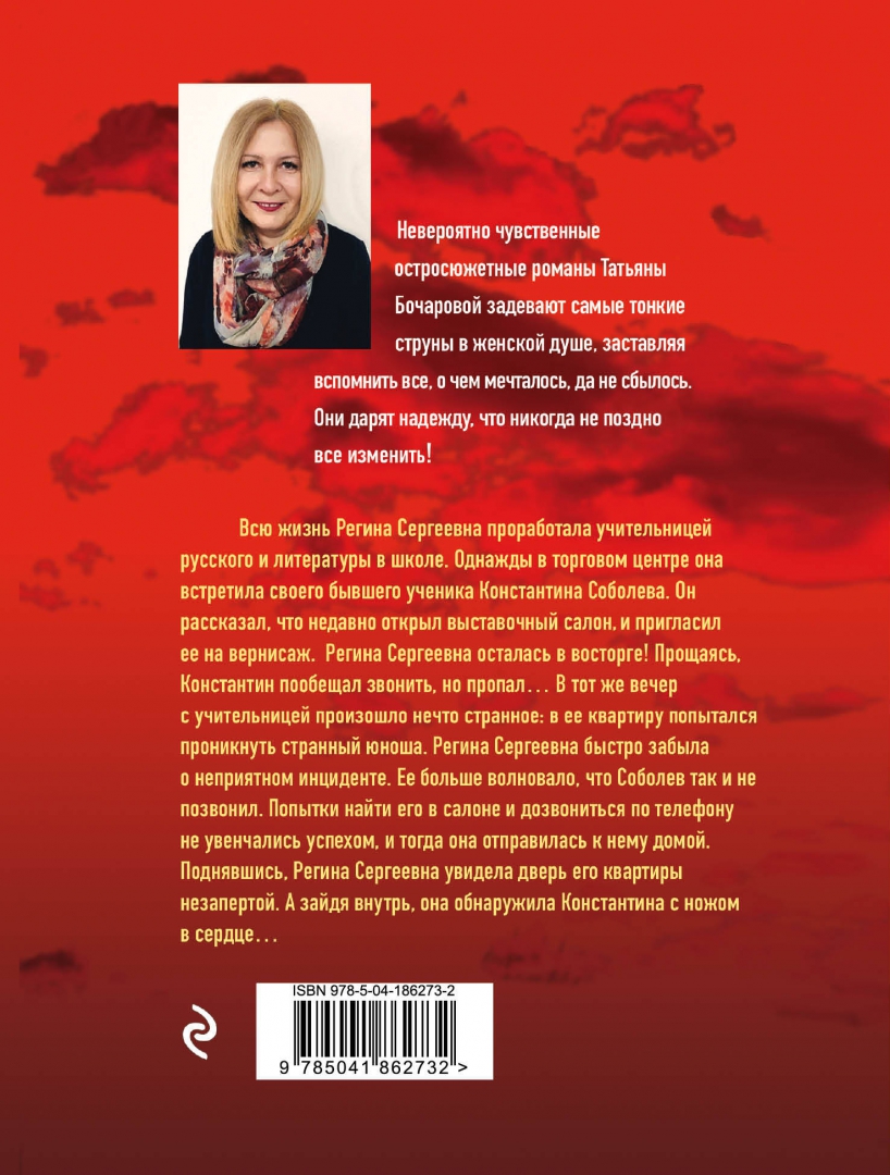 ОписаниеВсю жизнь Регина Сергеевна проработала учительницей. Однажды в торговом центре она встретила своего бывшего ученика Константина Соболева. Он рассказал, что недавно открыл выставочный салон и пригласил ее на вернисаж. Регина Сергеевна осталась в восторге! Прощаясь, Константин пообещал звонить, но пропал.… Ее беспокоило, что Соболев так и не позвонил. Попытки найти его не увенчались успехом, и тогда она отправилась к нему домой. Поднявшись, Регина Сергеевна увидела дверь его квартиры незапертой. А зайдя внутрь, она обнаружила Константина с ножом в сердце… В своих романах Татьяна Бочарова синтезирует разные жанры: это и детектив, и мелодрама, и обязательно лирическая история о человеческих чувствах и переживаниях. Ее герои - простые люди, наши с вами современники, которые волею судьбы оказались в сложной ситуации. Им предстоит сделать непростой выбор, разобраться в дебрях козней и обмана, не сломаться, выстоять, помочь не только себе, но и тем, кому необходима их помощь.Всю жизнь Регина Сергеевна проработала учительницей. Однажды в торговом центре она встретила своего бывшего ученика Константина Соболева. Он рассказал, что недавно открыл выставочный салон и пригласил ее на вернисаж. Регина Сергеевна осталась в восторге! Прощаясь, Константин пообещал звонить, но пропал.… Ее беспокоило, что Соболев так и не позвонил. Попытки найти его не увенчались успехом, и тогда она отправилась к нему домой. Поднявшись, Регина Сергеевна увидела дверь его квартиры незапертой. А зайдя внутрь, она обнаружила Константина с ножом в сердце… В своих романах Татьяна Бочарова синтезирует разные жанры: это и детектив, и мелодрама, и обязательно лирическая история о человеческих чувствах и переживаниях. Ее герои - простые люди, наши с вами современники, которые волею судьбы оказались в сложной ситуации. Им предстоит сделать непростой выбор, разобраться в дебрях козней и обмана, не сломаться, выстоять, помочь не только себе, но и тем, кому необходима их помощь.
