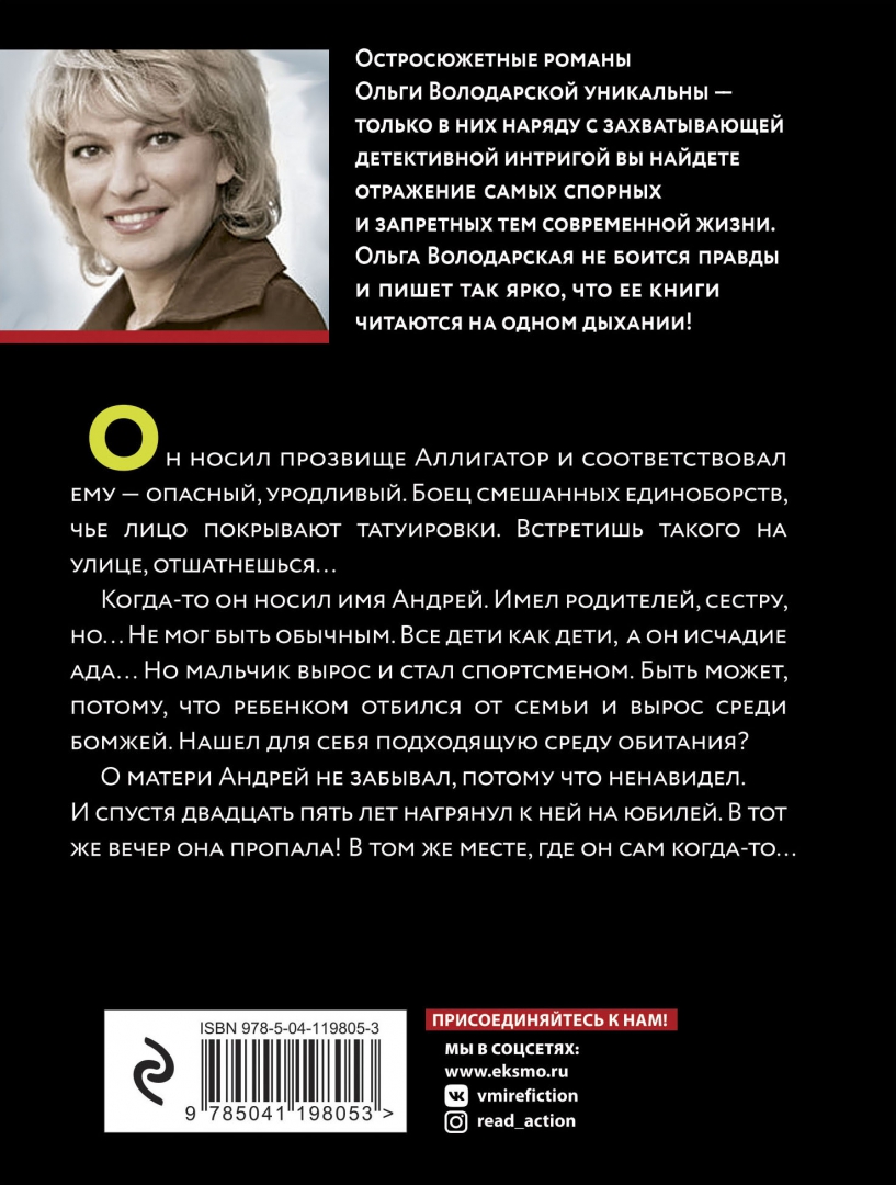 ОписаниеОн носил прозвище Аллигатор и соответствовал ему — опасный, уродливый. Боец смешанных единоборств, чье лицо покрывают татуировки. Встретишь такого на улице, отшатнешься... Когда-то он носил имя Андрей. Имел родителей, сестру, но... Не мог быть обычным. Все дети, как дети, а он исчадие ада... Но мальчик вырос и стал спортсменом. Быть может, потому, что ребенком отбился от семьи и вырос среди бомжей. Нашел для себя подходящую среду обитания?О матери Андрей не забывал, потому что ненавидел. И спустя двадцать пять лет нагрянул к ней на юбилей. В тот же вечер она пропала! В том же месте, где он сам когда-то…Он носил прозвище Аллигатор и соответствовал ему — опасный, уродливый. Боец смешанных единоборств, чье лицо покрывают татуировки. Встретишь такого на улице, отшатнешься... Когда-то он носил имя Андрей. Имел родителей, сестру, но... Не мог быть обычным. Все дети, как дети, а он исчадие ада... Но мальчик вырос и стал спортсменом. Быть может, потому, что ребенком отбился от семьи и вырос среди бомжей. Нашел для себя подходящую среду обитания?О матери Андрей не забывал, потому что ненавидел. И спустя двадцать пять лет нагрянул к ней на юбилей. В тот же вечер она пропала! В том же месте, где он сам когда-то…