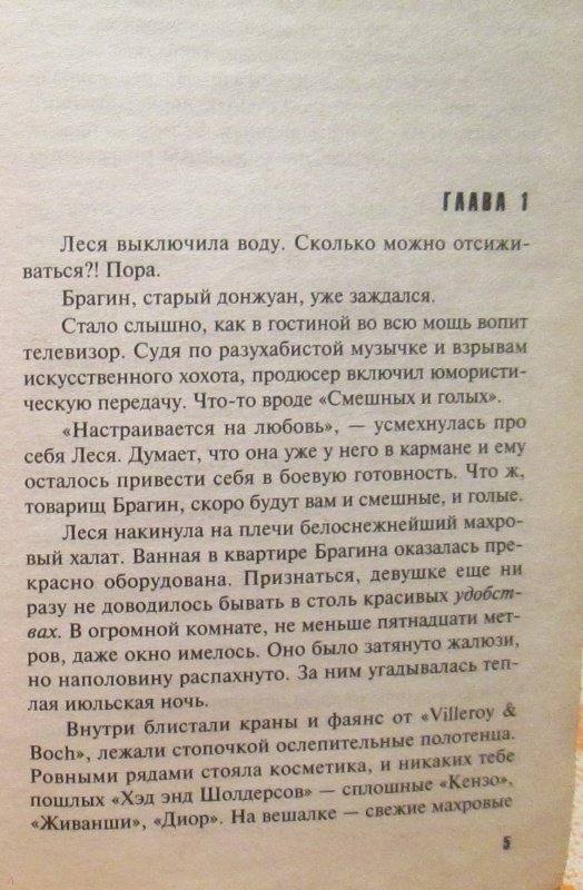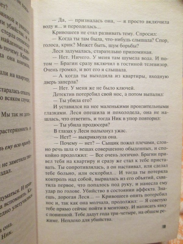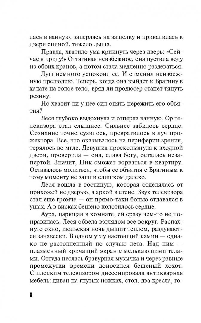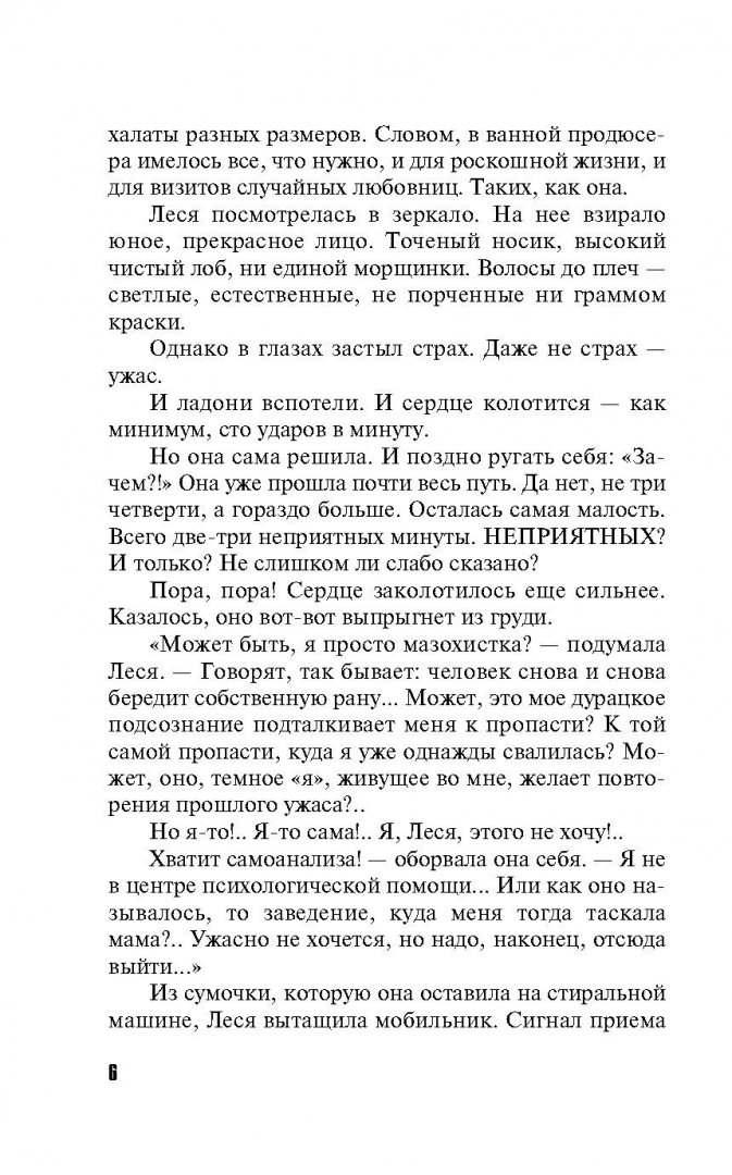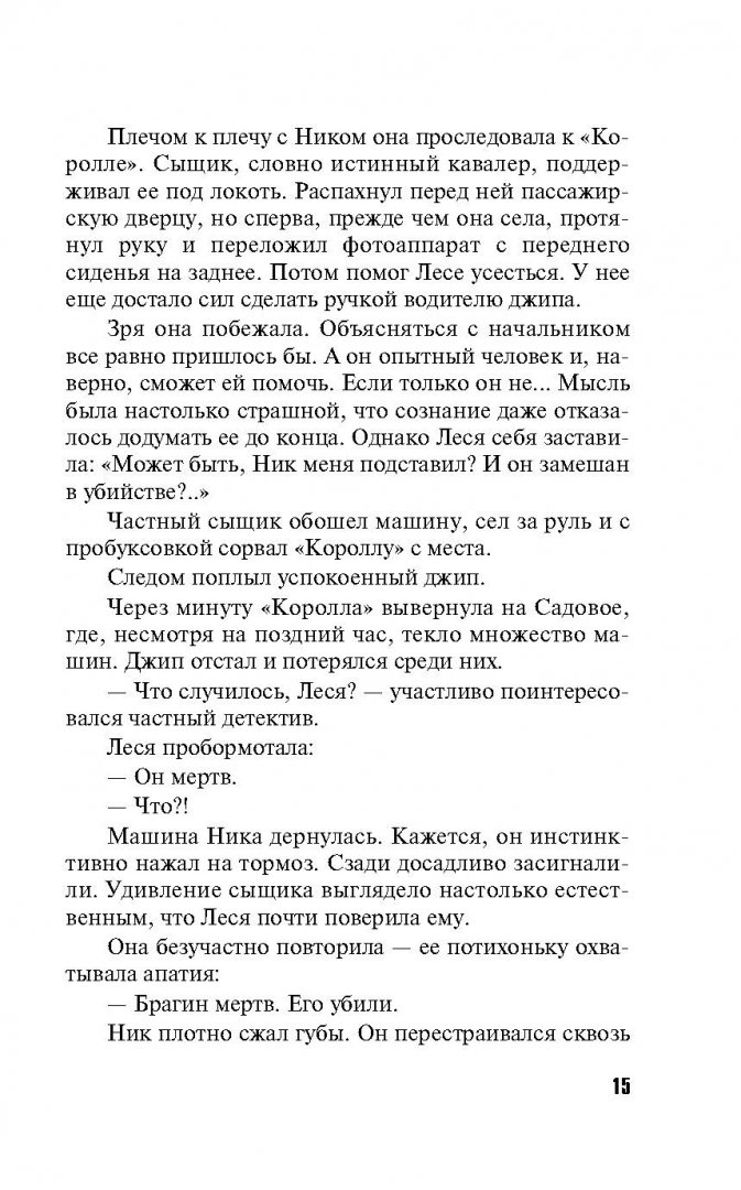 ОписаниеСтудентка юрфака Олеся Евдокимова проработала в детективном агентстве Ника Кривошеева всего две недели, а он уже дал ей сомнительное задание: соблазнить известного кинопродюсера Брагина. Лесе без труда удалось увлечь стареющего ловеласа, и Брагин пригласил ее в свои апартаменты на Патриарших. Чтобы собраться с духом перед решающей частью дела, Леся убежала в ванную, а когда вернулась, то с ужасом обнаружила, что Брагин мертв! Начав собственное расследование, Леся поняла - ее шеф Ник Кривошеев поделился с ней далеко не всей информацией…Студентка юрфака Олеся Евдокимова проработала в детективном агентстве Ника Кривошеева всего две недели, а он уже дал ей сомнительное задание: соблазнить известного кинопродюсера Брагина. Лесе без труда удалось увлечь стареющего ловеласа, и Брагин пригласил ее в свои апартаменты на Патриарших. Чтобы собраться с духом перед решающей частью дела, Леся убежала в ванную, а когда вернулась, то с ужасом обнаружила, что Брагин мертв! Начав собственное расследование, Леся поняла - ее шеф Ник Кривошеев поделился с ней далеко не всей информацией…
