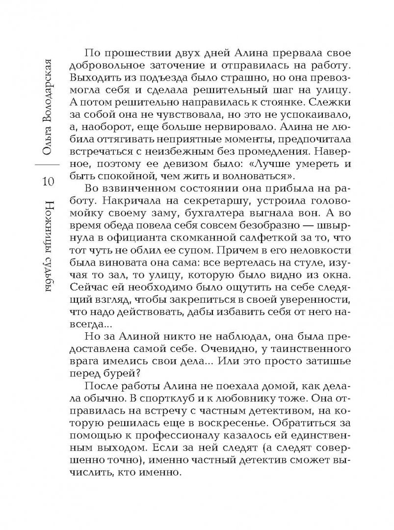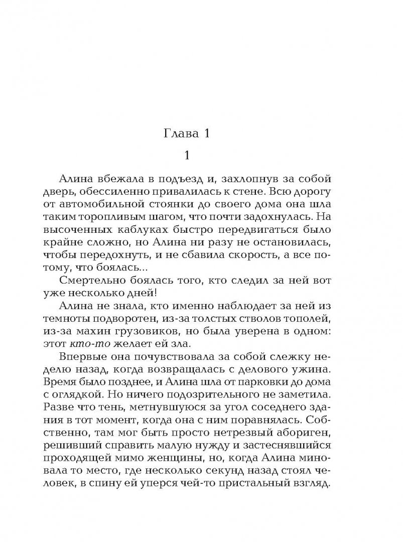ОписаниеАлина никогда не была хорошей девочкой… Уже подростком она знала, как добиться успеха, и шла к цели напролом. Тех, кого сметала со своего пути, Алина не жалела и даже не задумывалась, что наступит время, когда за свои грехи надо будет отвечать. Первый же удар судьбы отрезвил девушку - ее любимый Макс женился на другой…Миновали годы. А враги - те самые, из прошлого - остались… Макс вновь появился в ее жизни, но Алине было уже не до него: ее преследуют и хотят убить. Вместо нее погибает домработница Светлана, немного похожая на хозяйку - особенно когда она потихоньку примеряет ее вещи, украшения и делает такую же прическу… Кто перепутал двух женщин? И перепутали ли? Может, именно Света должны была стать жертвой, а Алине только кажется, что убрать хотели ее? Но слежка за ней продолжается…Алина никогда не была хорошей девочкой… Уже подростком она знала, как добиться успеха, и шла к цели напролом. Тех, кого сметала со своего пути, Алина не жалела и даже не задумывалась, что наступит время, когда за свои грехи надо будет отвечать. Первый же удар судьбы отрезвил девушку - ее любимый Макс женился на другой…Миновали годы. А враги - те самые, из прошлого - остались… Макс вновь появился в ее жизни, но Алине было уже не до него: ее преследуют и хотят убить. Вместо нее погибает домработница Светлана, немного похожая на хозяйку - особенно когда она потихоньку примеряет ее вещи, украшения и делает такую же прическу… Кто перепутал двух женщин? И перепутали ли? Может, именно Света должны была стать жертвой, а Алине только кажется, что убрать хотели ее? Но слежка за ней продолжается…