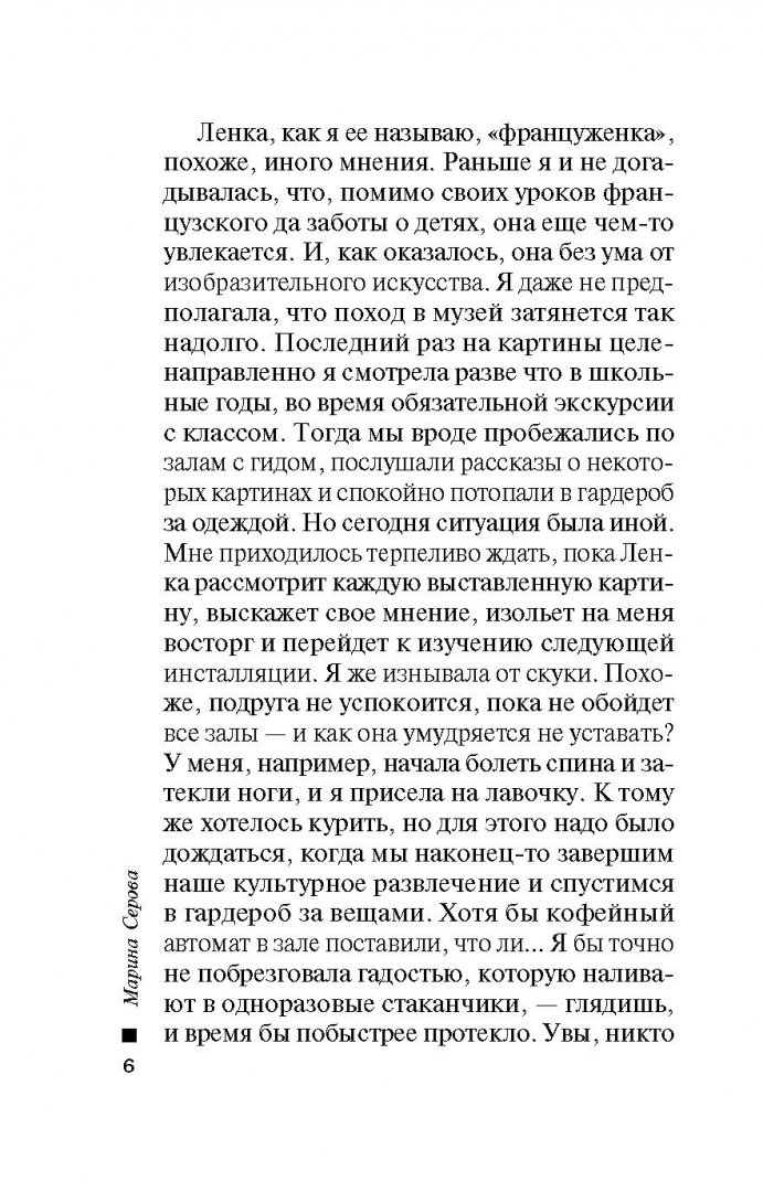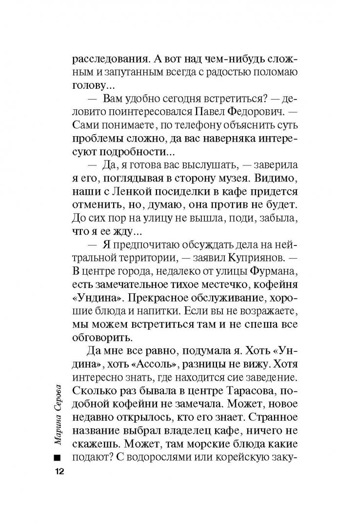 ОписаниеПоначалу частный детектив Татьяна Иванова думала, что задание ей досталось пустяковое: подумаешь, проследить за неверной женой и сделать компрометирующие ее фото. Но чем больше Иванова занималась слежкой за художницей Светланой Куприяновой, тем больше понимала - в этом деле не все так просто. Действительно ли, Светлану и ее преподавателя в художественной академии связывают близкие отношения или это только ширма? А дальше произошло то, чего никто не мог ожидать…Поначалу частный детектив Татьяна Иванова думала, что задание ей досталось пустяковое: подумаешь, проследить за неверной женой и сделать компрометирующие ее фото. Но чем больше Иванова занималась слежкой за художницей Светланой Куприяновой, тем больше понимала - в этом деле не все так просто. Действительно ли, Светлану и ее преподавателя в художественной академии связывают близкие отношения или это только ширма? А дальше произошло то, чего никто не мог ожидать…