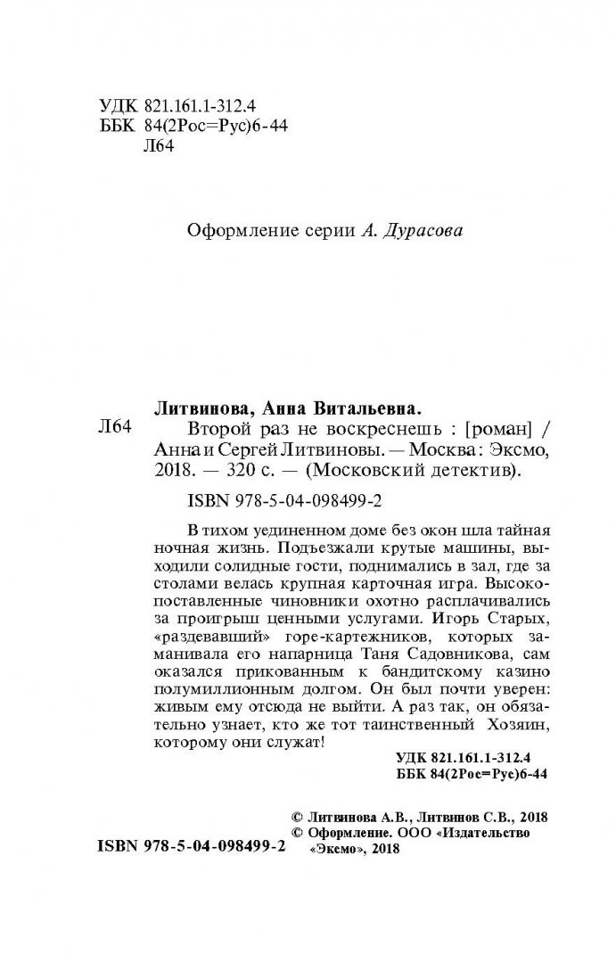 ---Литвинова, Литвинов: Второй раз не воскреснешьРусская классическая и современная литератураЗарубежная художественная литератураРусская художественная литератураФэнтезиДраматургияПоэзияПриключенияФантастикаЭпос и фольклорКлассическая прозаАфоризмыИсторическая прозаДетективыБасниСентиментальная прозаОтечественный боевикСовременная прозаМолодежная литератураЗарубежная классическая и современная литература