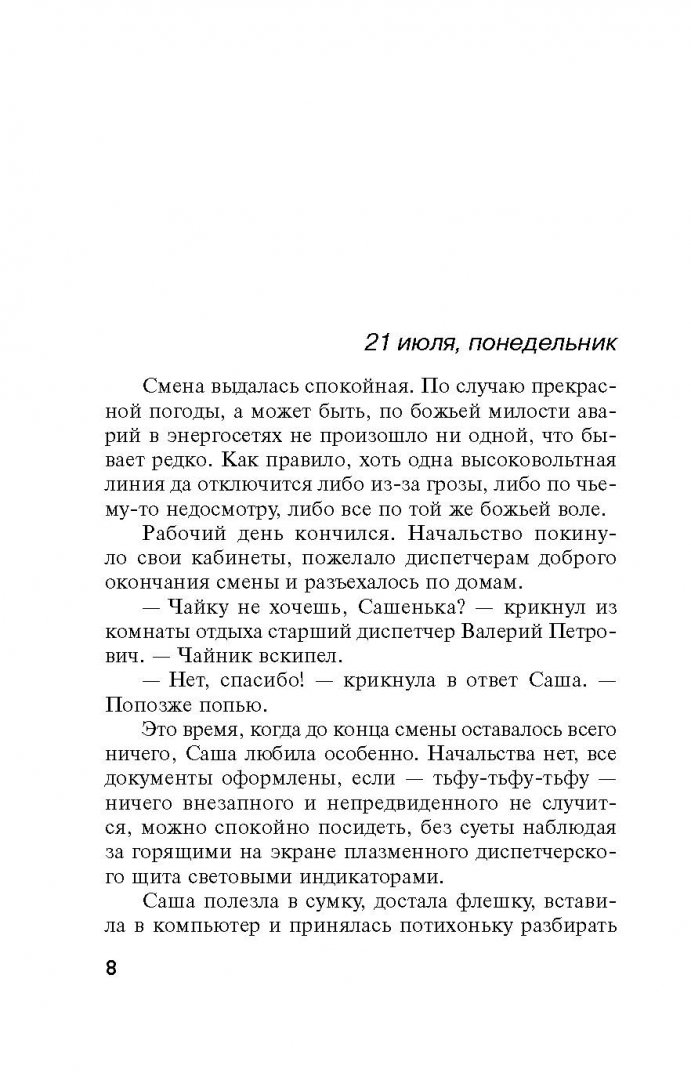 Описание"Я законченная старая дева, - поставила себе диагноз Саша. - Мисс Марпл". А как еще объяснить, что она взялась помогать коллеге Борису, попавшему в больницу после нападения бандитов? Это было не банальное ограбление! Борина девушка Юля рассказала - у нее похитили сестру Машу, и он отправился передавать выкуп, но все сразу пошло не по плану… По странному совпадению бандиты потребовали именно ту сумму, которая имелась у сестер. А вскоре Маша вернулась домой, но ничего не смогла толком рассказать кроме того, что ей по счастливому стечению обстоятельств удалось сбежать… Саша пока не подозревала: запутанная история на этом не заканчивается, а только начинается!"Я законченная старая дева, - поставила себе диагноз Саша. - Мисс Марпл". А как еще объяснить, что она взялась помогать коллеге Борису, попавшему в больницу после нападения бандитов? Это было не банальное ограбление! Борина девушка Юля рассказала - у нее похитили сестру Машу, и он отправился передавать выкуп, но все сразу пошло не по плану… По странному совпадению бандиты потребовали именно ту сумму, которая имелась у сестер. А вскоре Маша вернулась домой, но ничего не смогла толком рассказать кроме того, что ей по счастливому стечению обстоятельств удалось сбежать… Саша пока не подозревала: запутанная история на этом не заканчивается, а только начинается!
