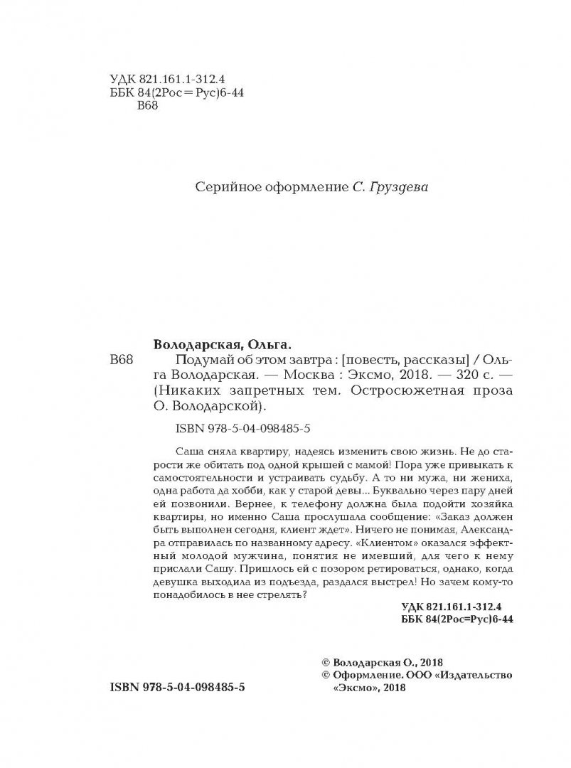 ---Ольга Володарская: Подумай об этом завтраРусская классическая и современная литератураЗарубежная художественная литератураРусская художественная литератураФэнтезиДраматургияПоэзияПриключенияФантастикаЭпос и фольклорКлассическая прозаАфоризмыИсторическая прозаДетективыБасниСентиментальная прозаОтечественный боевикСовременная прозаМолодежная литератураЗарубежная классическая и современная литература