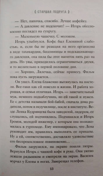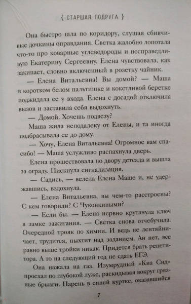 ОписаниеВ жизни Елены Громовой все прекрасно: она уважаемый руководитель, любимая жена и счастливая мать, готовая на все ради единственной дочки Светы. Когда той потребовались дополнительные занятия по химии, Елена сразу же нашла прекрасного репетитора. Студентка Наталья - красавица, умница и талантливый педагог, настоящий пример для подражания. Удивительно ли, что она быстро стала лучшей подругой доверчивой и простодушной Светки? Вот только Елене эта дружба девушек почему-то очень не нравится: в красивых глазах Натальи она угадывает чувство, похожее на ненависть. Причин ее Елена не знает… Или не помнит? Может, если заглянуть подальше в прошлое, причина найдется? Елене пришлось многое вспомнить, когда случилось непредвиденное: Наталья похитила Светку и увезла в неизвестном направлении…Елена Громова — главная героиня нового детективно-мелодраматического романа Татьяны Бочаровой «Старшая подруга» — заведует столичным детским садом, держит под каблуком супруга Игоря и обожает дочь Светлану. Света
