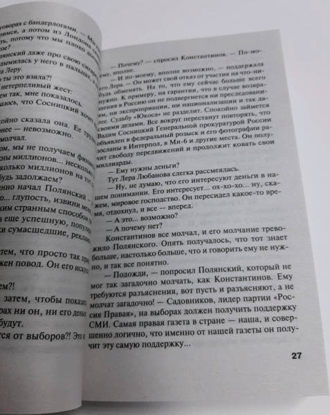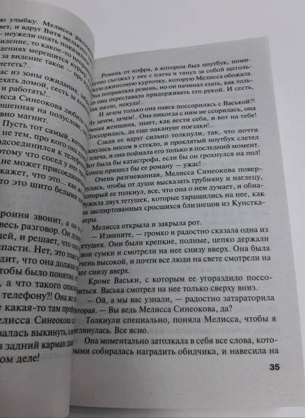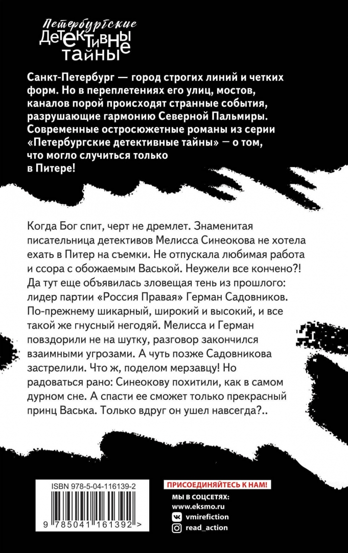 ОписаниеКогда Бог спит, черт не дремлет. Знаменитая писательница детективов Мелисса Синеокова не хотела ехать в Питер на съемки. Не отпускала любимая работа и ссора с обожаемым Васькой. Неужели все кончено?! Да тут еще объявилась зловещая тень из прошлого: лидер партии "Россия Правая" Герман Садовников. По-прежнему шикарный, широкий и высокий, и все такой же гнусный негодяй. Мелисса и Герман повздорили не на шутку, разговор закончился взаимными угрозами. А чуть позже Садовникова застрелили. Что ж, поделом мерзавцу! Но радоваться рано: Синеокову похитили, как в самом дурном сне. А спасти ее сможет только прекрасный принц Васька. Только вдруг он ушел навсегда?..Когда Бог спит, черт не дремлет. Знаменитая писательница детективов Мелисса Синеокова не хотела ехать в Питер на съемки. Не отпускала любимая работа и ссора с обожаемым Васькой. Неужели все кончено?! Да тут еще объявилась зловещая тень из прошлого: лидер партии "Россия Правая" Герман Садовников. По-прежнему шикарный, широкий и высокий, и все такой же гнусный негодяй. Мелисса и Герман повздорили не на шутку, разговор закончился взаимными угрозами. А чуть позже Садовникова застрелили. Что ж, поделом мерзавцу! Но радоваться рано: Синеокову похитили, как в самом дурном сне. А спасти ее сможет только прекрасный принц Васька. Только вдруг он ушел навсегда?..