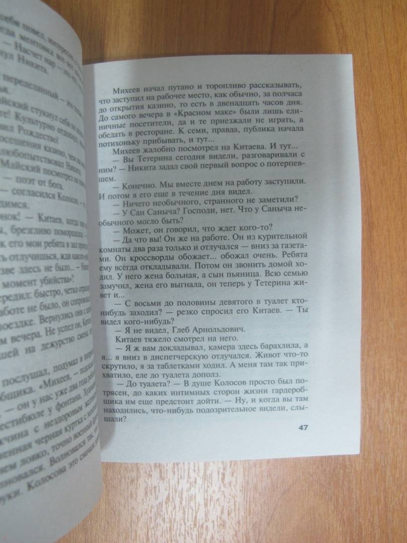 ОписаниеКазино - это не только рулетка, это образ жизни. Катя Петровская, сотрудница пресс-центра УВД, и майор "убойного отдела" Никита Колосов убедились в этом, расследуя три убийства в казино "Красный Мак". Роковые страсти и роковые женщины, большие деньги и отчаянный риск, взлеты и крушения - все здесь сконцентрировано до предела, все на грани взрыва. Что за этими преступлениями - происки конкурентов, личная месть или ревность, а может и того хуже - маниакальная одержимость? Версий, фактов, улик - много, а разгадка криминальной шарады по-прежнему в тумане. И даже когда Никита и Катя вплотную приблизились к ней, они отказываются верить, что подобное возможно...Казино - это не только рулетка, это образ жизни. Катя Петровская, сотрудница пресс-центра УВД, и майор "убойного отдела" Никита Колосов убедились в этом, расследуя три убийства в казино "Красный Мак". Роковые страсти и роковые женщины, большие деньги и отчаянный риск, взлеты и крушения - все здесь сконцентрировано до предела, все на грани взрыва. Что за этими преступлениями - происки конкурентов, личная месть или ревность, а может и того хуже - маниакальная одержимость? Версий, фактов, улик - много, а разгадка криминальной шарады по-прежнему в тумане. И даже когда Никита и Катя вплотную приблизились к ней, они отказываются верить, что подобное возможно...