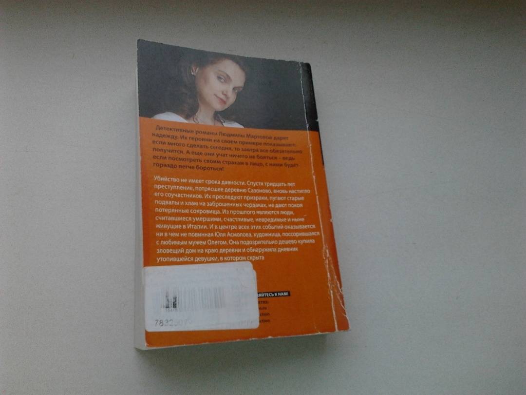 ОписаниеУбийство не имеет срока давности. Спустя тридцать лет преступление, потрясшее деревню Сазоново, вновь настигло его соучастников. Их преследуют призраки, пугают старые подвалы и хлам на заброшенных чердаках, не дают покоя потерянные сокровища. Из прошлого являются люди, считавшиеся умершими, счастливые, невредимые и ныне живущие в Италии. И в центре всех этих событий оказывается ни в чем не повинная Юля Асмолова, художница, поссорившаяся с любимым мужем Олегом. Она подозрительно дешево купила зловещий дом на краю деревни и обнаружила дневник утопившейся девушки, в котором скрыта какая-то тайна…Убийство не имеет срока давности. Спустя тридцать лет преступление, потрясшее деревню Сазоново, вновь настигло его соучастников. Их преследуют призраки, пугают старые подвалы и хлам на заброшенных чердаках, не дают покоя потерянные сокровища. Из прошлого являются люди, считавшиеся умершими, счастливые, невредимые и ныне живущие в Италии. И в центре всех этих событий оказывается ни в чем не повинная Юля Асмолова, художница, поссорившаяся с любимым мужем Олегом. Она подозрительно дешево купила зловещий дом на краю деревни и обнаружила дневник утопившейся девушки, в котором скрыта какая-то тайна…