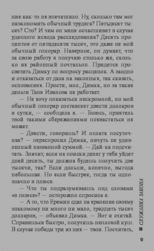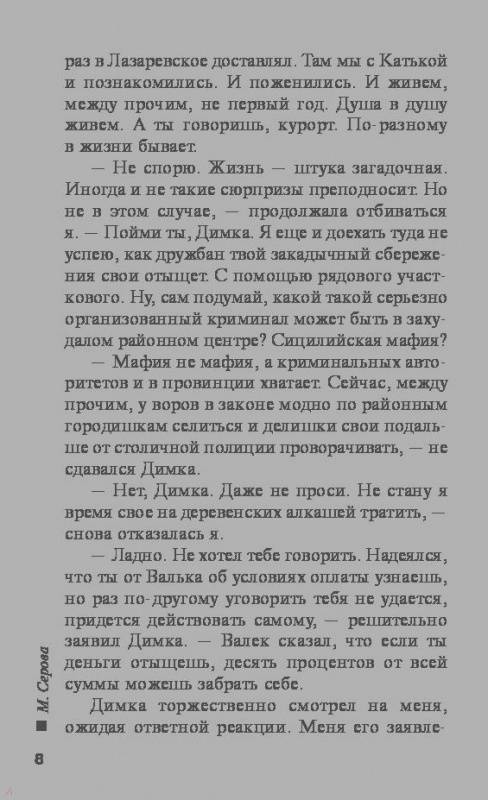 ОписаниеПока частный сыщик Татьяна Иванова добиралась до отдаленной деревни, где обитал ее новый клиент - фермер Валентин Еремин, у которого украли крупную сумму денег, нужда в ее услугах отпала: пропажа якобы нашлась. Татьяна отправилась домой, но далеко не уехала: сначала проколола две шины, а потом ее машина и вовсе осталась без колес. Невольно задержавшись в сельской глуши, Татьяна была таки вынуждена помогать Еремину. Его арестовали по подозрению в убийстве Рыхлина, из сейфа которого и были украдены злосчастные деньги. Один из свидетелей рассказал, что видел на месте преступления.... черта с рогами и хвостом. Иванова была уверена, что это бред местного дурачка, пока сама нос к носу не столкнулась с хвостатым исчадием ада!Пока частный сыщик Татьяна Иванова добиралась до отдаленной деревни, где обитал ее новый клиент - фермер Валентин Еремин, у которого украли крупную сумму денег, нужда в ее услугах отпала: пропажа якобы нашлась. Татьяна отправилась домой, но далеко не уехала: сначала проколола две шины, а потом ее машина и вовсе осталась без колес. Невольно задержавшись в сельской глуши, Татьяна была таки вынуждена помогать Еремину. Его арестовали по подозрению в убийстве Рыхлина, из сейфа которого и были украдены злосчастные деньги. Один из свидетелей рассказал, что видел на месте преступления.... черта с рогами и хвостом. Иванова была уверена, что это бред местного дурачка, пока сама нос к носу не столкнулась с хвостатым исчадием ада!