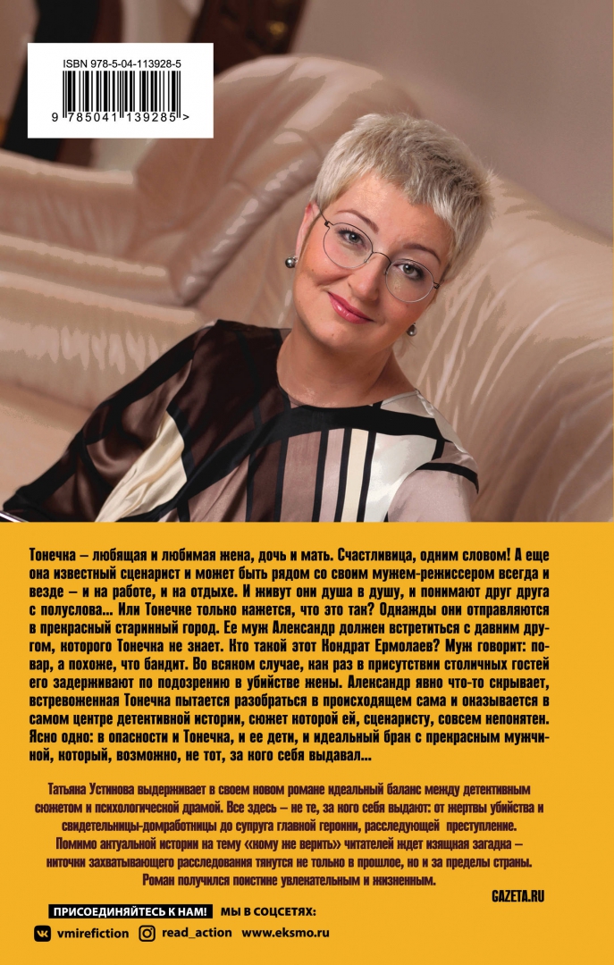СвернутьТонечка - любящая и любимая жена, дочь и мать. Счастливица, одним словом! А еще она известный сценарист и может быть рядом со своим мужем-режиссером всегда и везде - и на работе, и на отдыхе. И живут они душа в душу, и понимают друг друга с полуслова… Или Тонечке только кажется, что это так? Однажды они отправляются в прекрасный старинный город. Её муж Александр должен встретиться с давним другом, которого Тонечка не знает. Кто такой этот Кондрат Ермолаев? Муж говорит - повар, а похоже, что бандит. Во всяком случае, как раз в присутствии столичных гостей его задерживают по подозрению в убийстве жены. Александр явно что-то скрывает, встревоженная Тонечка пытается разобраться в происходящем сама - и оказывается в самом центре детективной истории, сюжет которой ей, сценаристу, совсем непонятен. Ясно одно: в опасности и Тонечка, и ее дети, и идеальный брак с прекрасным мужчиной, который, возможно, не тот, за кого себя выдавал…Татьяне Устиновой, блистательной и неповторимой звезде отечественного детектива, так полюбились герои ее недавнего бестселлера «Серьга Артемиды», что она решила порадовать читателей новой историей с их участием. В ее