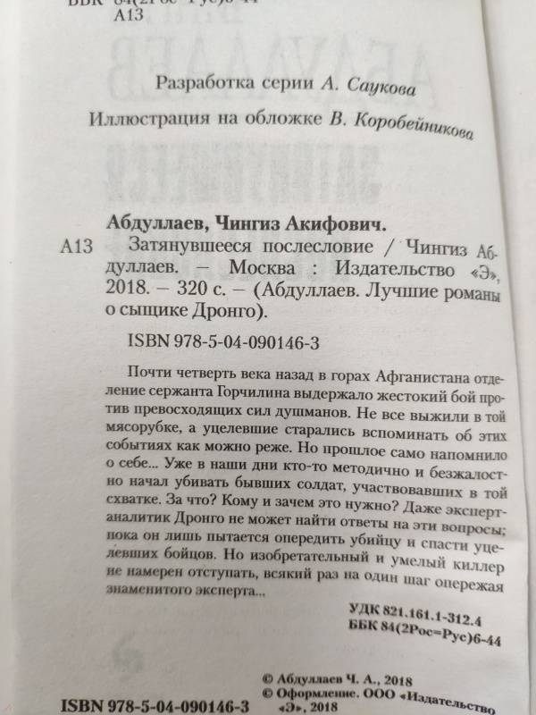 Объем, стр. 320 ISBN 978-5-04-090146-3 Автор Абдуллаев Чингиз Акифович Серия Абдуллаев. Лучшие романы о сыщике Дронго.Эк. Минимальный возраст 16+ Год издания книги 2018 Тип обложки Мягкий переплет Иллюстрации Без иллюстраций Вес, г 126г Размеры 165х104х20 мм - Отзывы