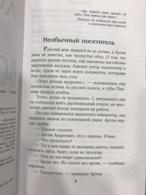 ОписаниеВ средствах массовой информации об этом даже не упоминают, а все потому что проблема слишком страшна. К адвокату Артему Павлову на прием записывается женщина, у нее пропал восемнадцатилетний сын. Женщине известно, что ее сын попал с другом в автомобильную аварию, после чего был отвезен в больницу. Дальше о нем ничего не известно. Павлов решает разобраться в этом деле, следы приводят его в благотворительный фонд "Поделись сердцем". Этот фонд кажется на первый взгляд делает благое дело, помогает людям пройти бесплатное лечение в клинике "МедКР". Но есть одна тайна, все кто решил там лечится, умерли…В средствах массовой информации об этом даже не упоминают, а все потому что проблема слишком страшна. К адвокату Артему Павлову на прием записывается женщина, у нее пропал восемнадцатилетний сын. Женщине известно, что ее сын попал с другом в автомобильную аварию, после чего был отвезен в больницу. Дальше о нем ничего не известно. Павлов решает разобраться в этом деле, следы приводят его в благотворительный фонд "Поделись сердцем". Этот фонд кажется на первый взгляд делает благое дело, помогает людям пройти бесплатное лечение в клинике "МедКР". Но есть одна тайна, все кто решил там лечится, умерли…