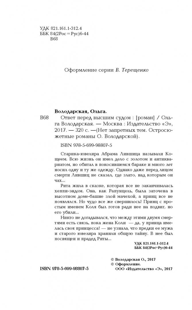 ---Ольга Володарская: Ответ перед высшим судомРусская классическая и современная литератураЗарубежная художественная литератураРусская художественная литератураФэнтезиДраматургияПоэзияПриключенияФантастикаЭпос и фольклорКлассическая прозаАфоризмыИсторическая прозаДетективыБасниСентиментальная прозаОтечественный боевикСовременная прозаМолодежная литератураЗарубежная классическая и современная литература