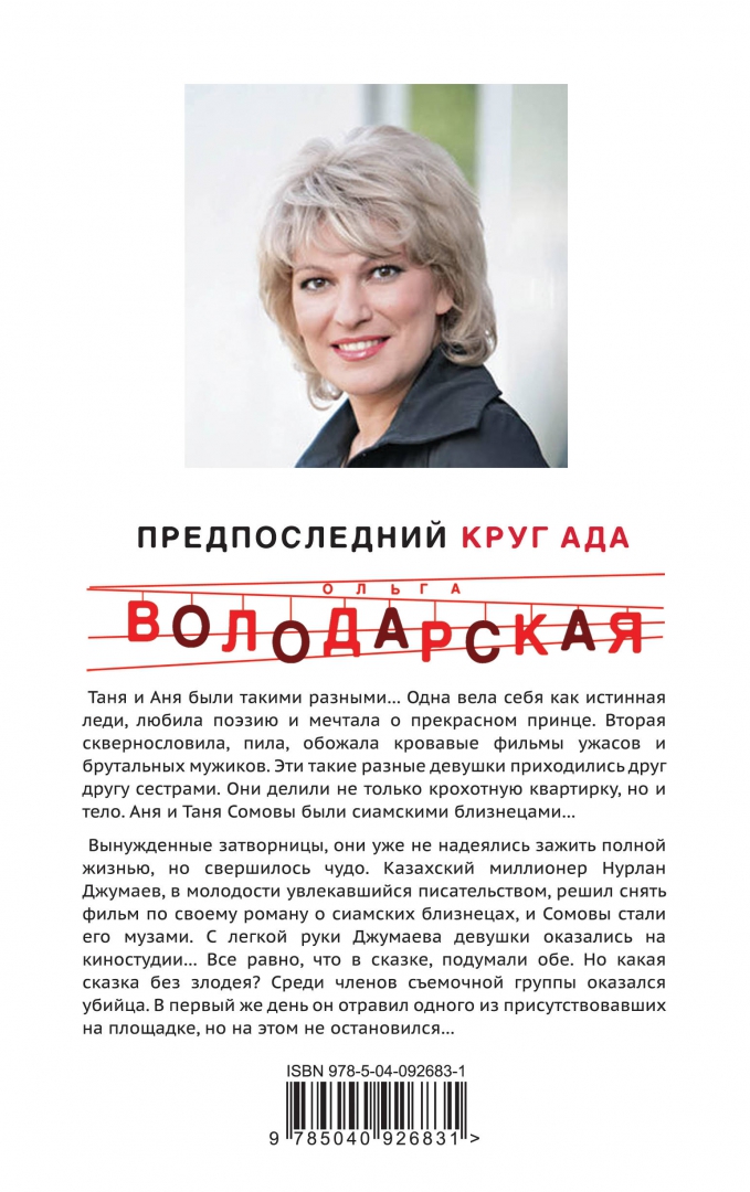 ОписаниеТаня и Аня были такими разными… Одна вела себя как истинная леди, любила поэзию и мечтала о прекрасном принце. Вторая сквернословила, пила, обожала кровавые фильмы ужасов и брутальных мужиков. Эти такие разные девушки приходились друг другу сестрами. Они делили не только крохотную квартирку, но и тело. Аня и Таня Сомовы были сиамскими близнецами…Вынужденные затворницы, они уже не надеялись зажить полной жизнью, но свершилось чудо. Казахский миллионер Нурлан Джумаев, в молодости увлекавшийся писательством, решил снять фильм по своему роману о сиамских близнецах, и Сомовы стали его музами. С легкой руки Джумаева девушки оказались на киностудии… Все равно что в сказке, подумали обе. Но какая сказка без злодея? Среди членов съемочной группы оказался убийца. В первый же день он отравил одного из присутствовавших на площадке, но на этом не остановился…Таня и Аня были такими разными… Одна вела себя как истинная леди, любила поэзию и мечтала о прекрасном принце. Вторая сквернословила, пила, обожала кровавые фильмы ужасов и брутальных мужиков. Эти такие разные девушки приходились друг другу сестрами. Они делили не только крохотную квартирку, но и тело. Аня и Таня Сомовы были сиамскими близнецами…Вынужденные затворницы, они уже не надеялись зажить полной жизнью, но свершилось чудо. Казахский миллионер Нурлан Джумаев, в молодости увлекавшийся писательством, решил снять фильм по своему роману о сиамских близнецах, и Сомовы стали его музами. С легкой руки Джумаева девушки оказались на киностудии… Все равно что в сказке, подумали обе. Но какая сказка без злодея? Среди членов съемочной группы оказался убийца. В первый же день он отравил одного из присутствовавших на площадке, но на этом не остановился…