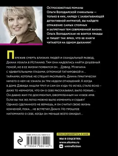 ОписаниеПережив смерть близких людей и скандальный развод, Диана уехала в Испанию. Там она надеялась найти душевный покой, но в ее жизни появился он… Дэвид. Мужчина с удивительными глазами, огромной татуировкой и… тайнами, которые не спешил раскрывать. Диана практически ничего о нем не узнала за три недели отношений. А когда в доме Дэвида нашли труп, а сам он куда-то исчез, стало ясно — даже то немногое, что он о себе рассказывал, было ложью… Он давно жил по документам, оформленным на чужое имя. Если бы так же легко можно было изменить и судьбу! Однако сделанного не вернешь, и он считал свою жизнь конченной, пока… не встретил Диану. Но прошлое напомнило о себе, когда он меньше всего ожидал… Романы Ольги Володарской — остросоциальные детективы, в которых автор препарирует все стороны жизни современного общества, ничего не скрывая и ни о чем не умалчивая. Ее книги написаны так увлекательно, что оторваться просто невозможно. Яркий сочный язык и блестящий авторский стиль создают неповторимую атмосферу, в которую с головой погружается читатель.СвернутьПережив смерть близких людей и скандальный развод, Диана уехала в Испанию. Там она надеялась найти душевный покой, но в ее жизни появился он… Дэвид. Мужчина с удивительными глазами, огромной татуировкой и… тайнами, которые не спешил раскрывать. Диана практически ничего о нем не узнала за три недели отношений. А когда в доме Дэвида нашли труп, а сам он куда-то исчез, стало ясно — даже то немногое, что он о себе рассказывал, было ложью… Он давно жил по документам, оформленным на чужое имя. Если бы так же легко можно было изменить и судьбу! Однако сделанного не вернешь, и он считал свою жизнь конченной, пока… не встретил Диану. Но прошлое напомнило о себе, когда он меньше всего ожидал… Романы Ольги Володарской — остросоциальные детективы, в которых автор препарирует все стороны жизни современного общества, ничего не скрывая и ни о чем не умалчивая. Ее книги написаны так увлекательно, что оторваться просто невозможно. Яркий сочный язык и блестящий авторский стиль создают неповторимую атмосферу, в которую с головой погружается читатель.СвернутьСвернуть