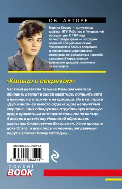ОписаниеМарина Серова - феномен современного отечественного детективного жанра. Выпускница юрфака МГУ, работала в Генеральной прокуратуре. С 1987 года по настоящее время - сотрудник одной из специальных служб. Участвовала в боевых операциях и оперативных мероприятиях. Автор ряда остросюжетных повестей, суммарный тираж которых превышает двадцать миллионов экземпляров. В этот раз Марина Серова представляет новинку - детектив о сложной работе частного детектива Татьяны Ивановой. Частный детектив Татьяна Иванова мечтала обновить ремонт в своей квартире, починить авто и наконец-то отдохнуть на природе. Но в коттедже "Дуб и липа" ее вместо отдыха ждал неприятный сюрприз. Таня обнаружила отрубленную женскую руку с приметным немецким кольцом на пальце. А вскоре к детективу Ивановой обратилась известная бизнесвумен Еккельман. У нее пропала дочь Ольга, и все следы исчезнувшей девушки ведут к злосчастному коттеджу…Марина Серова - феномен современного отечественного детективного жанра. Выпускница юрфака МГУ, работала в Генеральной прокуратуре. С 1987 года по настоящее время - сотрудник одной из специальных служб. Участвовала в боевых операциях и оперативных мероприятиях. Автор ряда остросюжетных повестей, суммарный тираж которых превышает двадцать миллионов экземпляров. В этот раз Марина Серова представляет новинку - детектив о сложной работе частного детектива Татьяны Ивановой. Частный детектив Татьяна Иванова мечтала обновить ремонт в своей квартире, починить авто и наконец-то отдохнуть на природе. Но в коттедже "Дуб и липа" ее вместо отдыха ждал неприятный сюрприз. Таня обнаружила отрубленную женскую руку с приметным немецким кольцом на пальце. А вскоре к детективу Ивановой обратилась известная бизнесвумен Еккельман. У нее пропала дочь Ольга, и все следы исчезнувшей девушки ведут к злосчастному коттеджу…