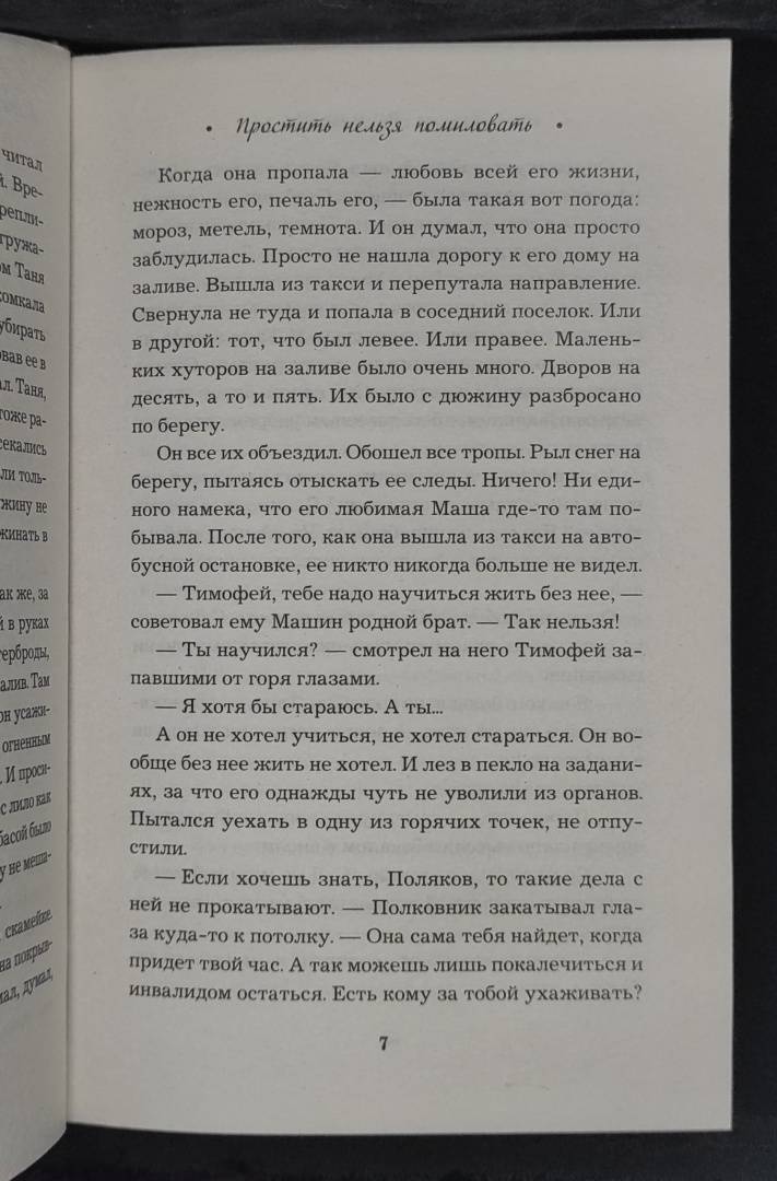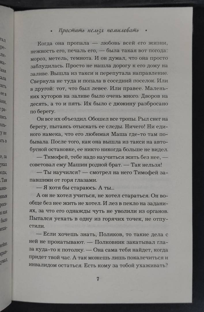 ОписаниеПрошло три года с тех пор, как пропала любимая девушка майора Полякова — Мария Белозерова. Тогда в городе действовал маньяк, насильник и убийца, и Машу сочли его жертвой. А сейчас неподалеку от дома Полякова найдено тело женщины. Несчастную убили полгода назад, генетический анализ показывает, что это не Маша, но на ней вещи, в которых пропавшая Белозерова была в день своего исчезновения! Майор Поляков под подозрением и отстранен от дела, но он начинает самостоятельное расследование вместе с местным тележурналистом. Не хочется раскрывать все секреты нового романа Галины Романовой «Простить нельзя помиловать» — это предстоит сделать читателю. По замыслу автора, это очень интригующая и трогательная история о том, насколько мы ответственны за то, что делаем со своей собственной жизнью. Несколько увлекательных сюжетных линий, повествующих о судьбах разных людей, развиваются параллельно, чтобы в финале сплестись в узел, когда все тайны будут раскрыты, а злодеи выведены на чистую воду.СвернутьПрошло три года с тех пор, как пропала любимая девушка майора Полякова — Мария Белозерова. Тогда в городе действовал маньяк, насильник и убийца, и Машу сочли его жертвой. А сейчас неподалеку от дома Полякова найдено тело женщины. Несчастную убили полгода назад, генетический анализ показывает, что это не Маша, но на ней вещи, в которых пропавшая Белозерова была в день своего исчезновения! Майор Поляков под подозрением и отстранен от дела, но он начинает самостоятельное расследование вместе с местным тележурналистом. Не хочется раскрывать все секреты нового романа Галины Романовой «Простить нельзя помиловать» — это предстоит сделать читателю. По замыслу автора, это очень интригующая и трогательная история о том, насколько мы ответственны за то, что делаем со своей собственной жизнью. Несколько увлекательных сюжетных линий, повествующих о судьбах разных людей, развиваются параллельно, чтобы в финале сплестись в узел, когда все тайны будут раскрыты, а злодеи выведены на чистую воду.СвернутьСвернуть