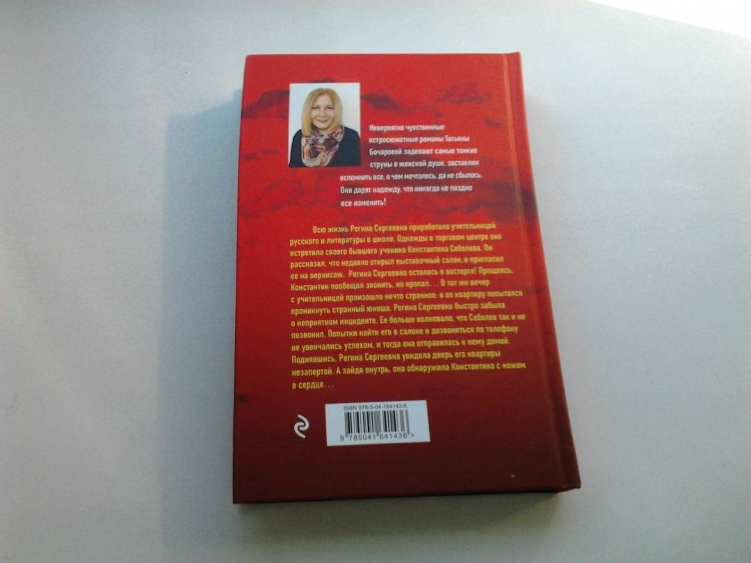 ОписаниеВсю жизнь Регина Сергеевна проработала учительницей. Однажды в торговом центре она встретила своего бывшего ученика Константина Соболева. Он рассказал, что недавно открыл выставочный салон и пригласил ее на вернисаж. Регина Сергеевна осталась в восторге! Прощаясь, Константин пообещал звонить, но пропал… Ее беспокоило, что Соболев так и не позвонил. Попытки найти его не увенчались успехом, и тогда она отправилась к нему домой. Поднявшись, Регина Сергеевна увидела дверь его квартиры незапертой. А зайдя внутрь, она обнаружила Константина с ножом в сердце… В своих романах Татьяна Бочарова синтезирует разные жанры: это и детектив, и мелодрама, и обязательно лирическая история о человеческих чувствах и переживаниях. Ее герои - простые люди, наши с вами современники, которые волею судьбы оказались в сложной ситуации. Им предстоит сделать непростой выбор, разобраться в дебрях козней и обмана, не сломаться, выстоять, помочь не только себе, но и тем, кому необходима их помощь.Всю жизнь Регина Сергеевна проработала учительницей. Однажды в торговом центре она встретила своего бывшего ученика Константина Соболева. Он рассказал, что недавно открыл выставочный салон и пригласил ее на вернисаж. Регина Сергеевна осталась в восторге! Прощаясь, Константин пообещал звонить, но пропал… Ее беспокоило, что Соболев так и не позвонил. Попытки найти его не увенчались успехом, и тогда она отправилась к нему домой. Поднявшись, Регина Сергеевна увидела дверь его квартиры незапертой. А зайдя внутрь, она обнаружила Константина с ножом в сердце… В своих романах Татьяна Бочарова синтезирует разные жанры: это и детектив, и мелодрама, и обязательно лирическая история о человеческих чувствах и переживаниях. Ее герои - простые люди, наши с вами современники, которые волею судьбы оказались в сложной ситуации. Им предстоит сделать непростой выбор, разобраться в дебрях козней и обмана, не сломаться, выстоять, помочь не только себе, но и тем, кому необходима их помощь.