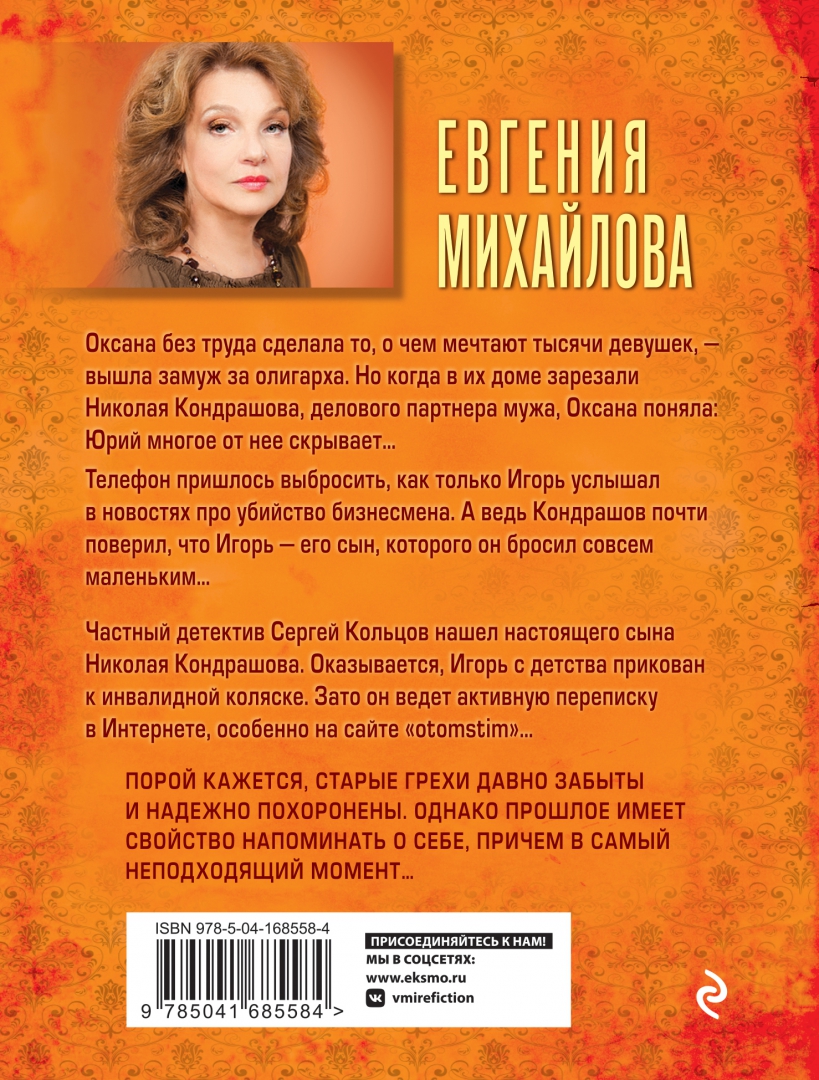 ОписаниеОксана без труда сделала то, о чем мечтают тысячи девушек — вышла замуж за олигарха. Но когда в их доме зарезали Николая Кондрашова, делового партнера мужа, Оксана поняла: Юрий многое от нее скрывает… Телефон пришлось выбросить, как только Игорь услышал в новостях про убийство бизнесмена. А ведь Кондрашов почти поверил, что Игорь — его сын, которого он бросил совсем маленьким… Частный детектив Сергей Кольцов нашел настоящего сына Николая Кондрашова. Оказывается, Игорь с детства прикован к инвалидной коляске. Зато он ведет активную переписку в Интернете, особенно на сайте «otomstim»… Порой кажется — старые грехи давно забыты и надежно похоронены. Однако прошлое имеет свойство напоминать о себе, причем в самый неподходящий момент… Евгения Михайлова много лет занималась журналистскими расследованиями. Героями ее публикаций становились невинно осужденные, воспитанники детских домов, люди, лишившиеся доброго имени, дома, надежды. И если порой в жизни борьба за справедливость терпит поражение, в детективных романах Евгении Михайловой истина и любовь побеждают всегда, несмотря на самые тяжелые испытания.СвернутьОксана без труда сделала то, о чем мечтают тысячи девушек — вышла замуж за олигарха. Но когда в их доме зарезали Николая Кондрашова, делового партнера мужа, Оксана поняла: Юрий многое от нее скрывает… Телефон пришлось выбросить, как только Игорь услышал в новостях про убийство бизнесмена. А ведь Кондрашов почти поверил, что Игорь — его сын, которого он бросил совсем маленьким… Частный детектив Сергей Кольцов нашел настоящего сына Николая Кондрашова. Оказывается, Игорь с детства прикован к инвалидной коляске. Зато он ведет активную переписку в Интернете, особенно на сайте «otomstim»… Порой кажется — старые грехи давно забыты и надежно похоронены. Однако прошлое имеет свойство напоминать о себе, причем в самый неподходящий момент… Евгения Михайлова много лет занималась журналистскими расследованиями. Героями ее публикаций становились невинно осужденные, воспитанники детских домов, люди, лишившиеся доброго имени, дома, надежды. И если порой в жизни борьба за справедливость терпит поражение, в детективных романах Евгении Михайловой истина и любовь побеждают всегда, несмотря на самые тяжелые испытания.СвернутьСвернуть