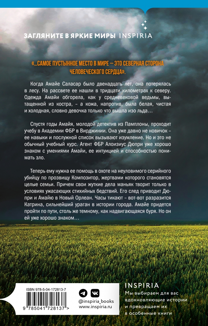 ОписаниеМеждународный бестселлер и национальный бестселлер ИспанииЛауреат премии "Grand Prix des Lectrices de Elle"Книги автора переведены на 38 языков мираВсе ее романы экранизированы"…Самое пустынное место в мире - это северная сторона человеческого сердца".Когда Амайе Саласар было двенадцать лет, она потерялась в лесу. На рассвете ее нашли в тридцати километрах к северу. Одежда Амайи обгорела, как у средневековой ведьмы, вытащенной из костра, - а кожа, напротив, была белая, чистая и холодная, словно девочка только что вышла изо льда…Спустя годы Амайя, молодой детектив из Памплоны, проходит учебу в Академии ФБР в Вирджинии. Она уже давно не новичок - ее навыки и послужной список вызывают изумление. Но и это не обычный учебный курс. Агент ФБР Алоизиус Дюпри уже хорошо знаком с умениями Амайи, ее интуицией и способностью понимать зло. Теперь ему нужна ее помощь в охоте на неуловимого серийного убийцу по прозвищу Композитор, жертвами которого становятся целые семьи. Причем свои жуткие дела маньяк творит только в условиях ужасающих стихийных бедствий. Его след приводит Дюпри и Амайю в Новый Орлеан. Часы тикают - вот-вот разразится Катрина, сильнейший ураган в истории города. Амайе придется пройти по пути, столь же темному, как надвигающаяся буря. Но он ей уже хорошо знаком…Масштабные сцены романа изобилуют яркими персонажами - от самоотверженных служителей закона до закоренелых убийц и даже персонажей, достойных фильмов ужасов.Wall Street JournalМифы и реальность смешиваются в этом сложном и остром триллере. Все скелеты ломятся в дверцы шкафов, чтобы освободиться, - и освобождаются…Стив БерриПотрясающая главная героиня.Изабель АльендеСвернутьМеждународный бестселлер и национальный бестселлер ИспанииЛауреат премии "Grand Prix des Lectrices de Elle"Книги автора переведены на 38 языков мираВсе ее романы экранизированы"…Самое пустынное место в мире - это северная сторона человеческого сердца".Когда Амайе Саласар было двенадцать лет, она потерялась в лесу. На рассвете ее нашли в тридцати километрах к северу. Одежда Амайи обгорела, как у средневековой ведьмы, вытащенной из костра, - а кожа, напротив, была белая, чистая и холодная, словно девочка только что вышла изо льда…Спустя годы Амайя, молодой детектив из Памплоны, проходит учебу в Академии ФБР в Вирджинии. Она уже давно не новичок - ее навыки и послужной список вызывают изумление. Но и это не обычный учебный курс. Агент ФБР Алоизиус Дюпри уже хорошо знаком с умениями Амайи, ее интуицией и способностью понимать зло. Теперь ему нужна ее помощь в охоте на неуловимого серийного убийцу по прозвищу Композитор, жертвами которого становятся целые семьи. Причем свои жуткие дела маньяк творит только в условиях ужасающих стихийных бедствий. Его след приводит Дюпри и Амайю в Новый Орлеан. Часы тикают - вот-вот разразится Катрина, сильнейший ураган в истории города. Амайе придется пройти по пути, столь же темному, как надвигающаяся буря. Но он ей уже хорошо знаком…Масштабные сцены романа изобилуют яркими персонажами - от самоотверженных служителей закона до закоренелых убийц и даже персонажей, достойных фильмов ужасов.Wall Street JournalМифы и реальность смешиваются в этом сложном и остром триллере. Все скелеты ломятся в дверцы шкафов, чтобы освободиться, - и освобождаются…Стив БерриПотрясающая главная героиня.Изабель АльендеСве