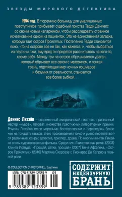ОписаниеВ тюремную больницу для умалишенных преступников прибывает судебный пристав Тедди Дэниелс со своим новым напарником, чтобы расследовать странное исчезновение одной из пациенток. Это не единственная загадка, которую таит остров Проклятых. Постепенно Тедди становится ясно, что на острове все не так, как кажется, и, чтобы выбраться из паутины лжи, ему вряд ли придется рассчитывать на кого-то, кроме себя. Между тем на остров обрушивается ураган, который обрывает все связи с материком, и тонкая грань, отделяющая мир ночных кошмаров и безумия от реальности, становится все более зыбкой… Роман Денниса Лихэйна "Остров Проклятых" стал мировым бестселлером и был переведен на многие языки, а режиссер Мартин Скорсезе снял по нему одноименный триллер с Леонардо Ди Каприо в главной роли.В тюремную больницу для умалишенных преступников прибывает судебный пристав Тедди Дэниелс со своим новым напарником, чтобы расследовать странное исчезновение одной из пациенток. Это не единственная загадка, которую таит остров Проклятых. Постепенно Тедди становится ясно, что на острове все не так, как кажется, и, чтобы выбраться из паутины лжи, ему вряд ли придется рассчитывать на кого-то, кроме себя. Между тем на остров обрушивается ураган, который обрывает все связи с материком, и тонкая грань, отделяющая мир ночных кошмаров и безумия от реальности, становится все более зыбкой… Роман Денниса Лихэйна "Остров Проклятых" стал мировым бестселлером и был переведен на многие языки, а режиссер Мартин Скорсезе снял по нему одноименный триллер с Леонардо Ди Каприо в главной роли.