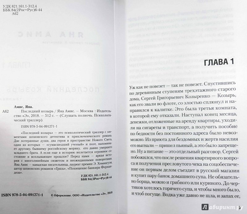 Описание"Последний козырь" - это психологический триллер с элементами шпионского детектива и приключенческого романа. Две потерянные души, два героя в пространстве Нового Света, один из которых - "сумасшедший ученый" и поэт, напоминает другому, бывшему российскому моряку, его давно умершего младшего брата. А если еще в историю вплетается огромное состояние и всплывающее прошлое? Перед нами - яркая история с многолинейным сюжетом и неожиданными поворотами.Яна Амис - канадская писательница, лауреат премии Э. Хемингуэя, автор шпионских романов "Грязь", "Похищение банкира Фернандеза"."Последний козырь" - это психологический триллер с элементами шпионского детектива и приключенческого романа. Две потерянные души, два героя в пространстве Нового Света, один из которых - "сумасшедший ученый" и поэт, напоминает другому, бывшему российскому моряку, его давно умершего младшего брата. А если еще в историю вплетается огромное состояние и всплывающее прошлое? Перед нами - яркая история с многолинейным сюжетом и неожиданными поворотами.Яна Амис - канадская писательница, лауреат премии Э. Хемингуэя, автор шпионских романов "Грязь", "Похищение банкира Фернандеза".