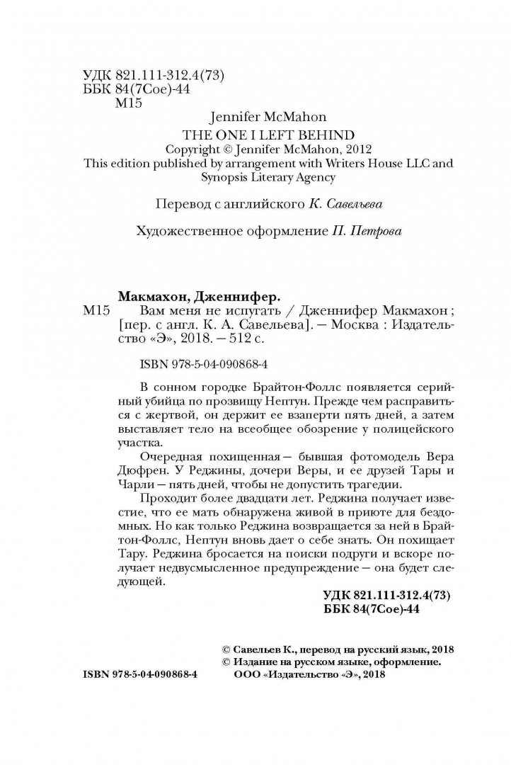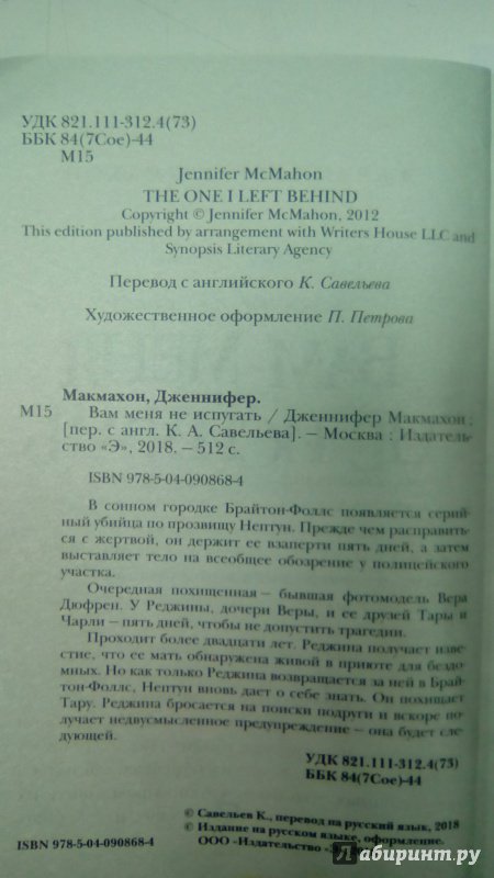 Объем, стр. 512 ISBN 978-5-04-090868-4 Автор Макмахон Дженнифер, Савельев Кирилл Александрович Переводчик Савельев Кирилл Александрович Серия Саспенс нового поколения (обл) Минимальный возраст 16+ Год издания книги 2018 Тип обложки Мягкий переплет Иллюстрации Без иллюстраций Вес, г 214г Размеры 165х116х19 мм - Отзывы