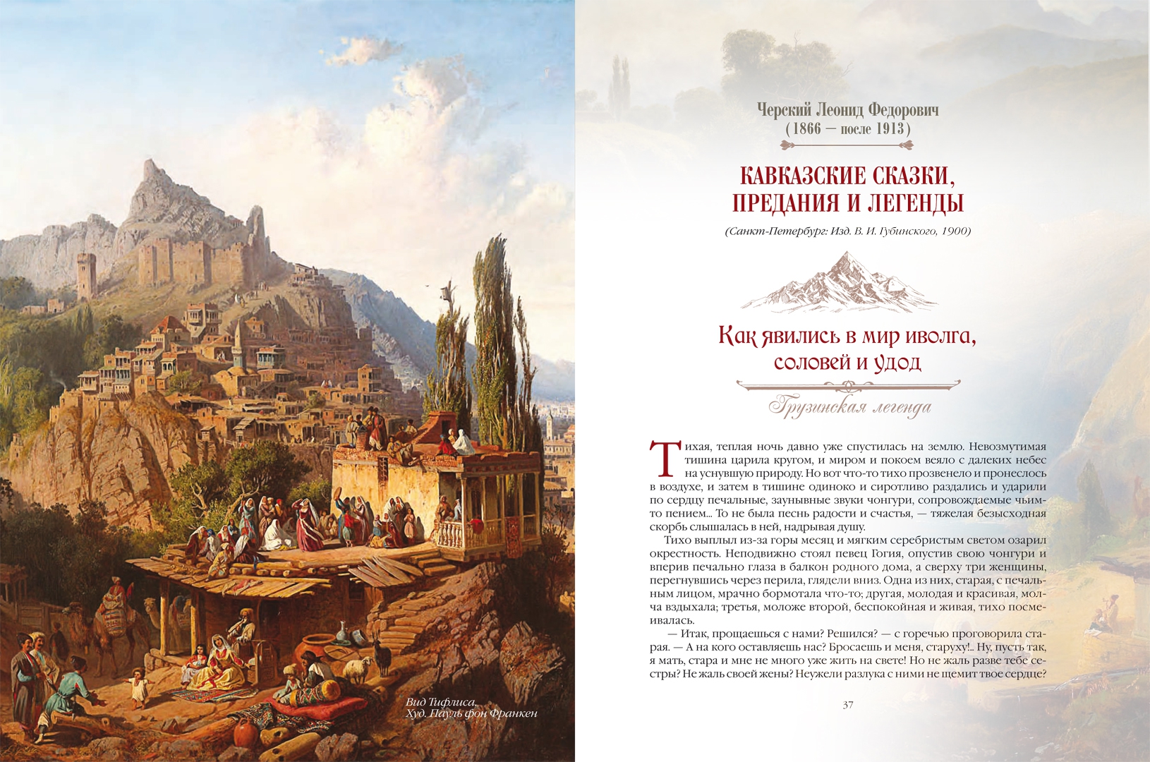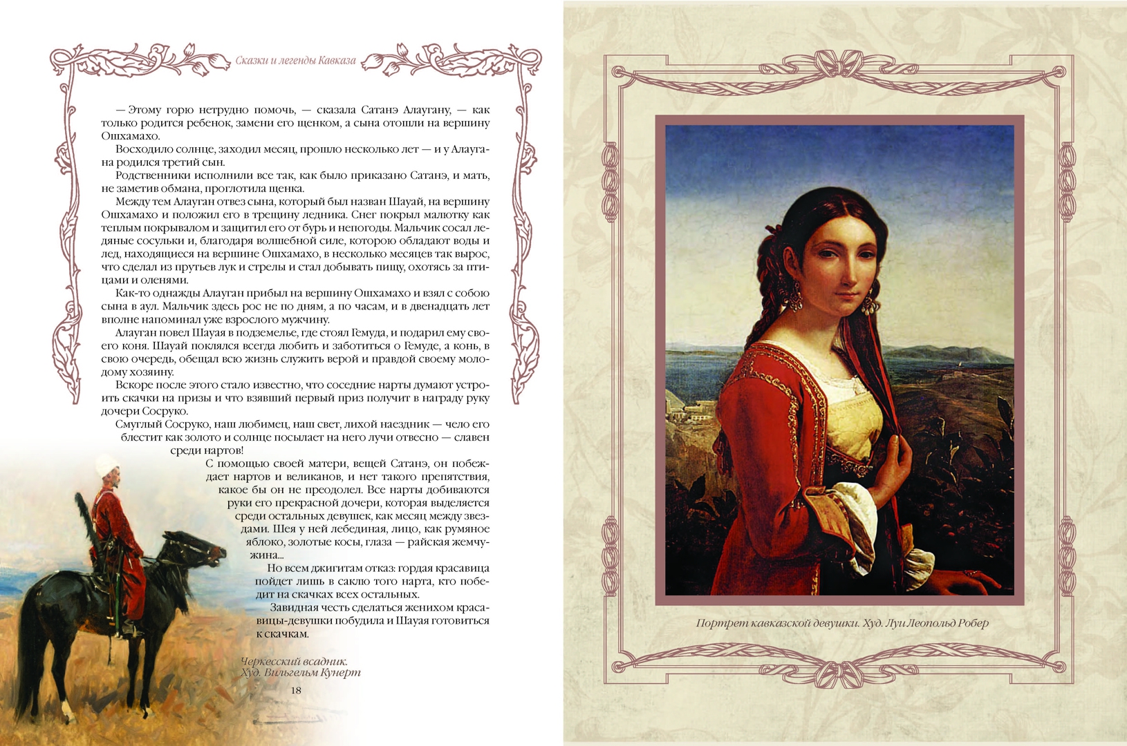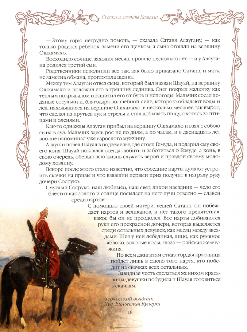 ОписаниеКавказский эпос является одним из древнейших героико-эпических произведений народов мира, стоя в одном ряду с "Илиадой", "Одиссеей", "Шахнаме", "Нибелунгами" и "Калевалой".В нашем сборнике представлено более тридцати кавказских сказок и легенд, любовно собранных и переработанных русскими фольклористами Л. Ф. Черским, Г. К. Дорофеевым, Е. 3. Барановым, В. А. Гатцуком, В. Н. Харузиной, В. Я. Светловым и другими. Опубликованные в 1895-1911 годах, впервые они выпускаются в виде единой антологии.Герои этих произведений - бесстрашные богатыри-нарты Сосру- ко, Алауган, Шауай и Сослан, их мудрая мать Сатаней, грозный бог кузнечного ремесла Тлепш, страшный дракон-зарьяг, хитрые джинны и злобные великаны - погружают читателей в мир снежных вершин и живописных водопадов, горных рек и плодородных пастбищ, открывая им сказочную вселенную, созданную фантазией жителей этого пленительного края.Создатель: С.З. Кодзова.Кавказский эпос является одним из древнейших героико-эпических произведений народов мира, стоя в одном ряду с "Илиадой", "Одиссеей", "Шахнаме", "Нибелунгами" и "Калевалой".В нашем сборнике представлено более тридцати кавказских сказок и легенд, любовно собранных и переработанных русскими фольклористами Л. Ф. Черским, Г. К. Дорофеевым, Е. 3. Барановым, В. А. Гатцуком, В. Н. Харузиной, В. Я. Светловым и другими. Опубликованные в 1895-1911 годах, впервые они выпускаются в виде единой антологии.Герои этих произведений - бесстрашные богатыри-нарты Сосру- ко, Алауган, Шауай и Сослан, их мудрая мать Сатаней, грозный бог кузнечного ремесла Тлепш, страшный дракон-зарьяг, хитрые джинны и злобные великаны - погружают читателей в мир снежных вершин и живописных водопадов, горных рек и плодородных пастбищ, открывая им сказочную вселенную, созданную фантазией жителей этого пленительного края.Создатель: С.З. Кодзова.