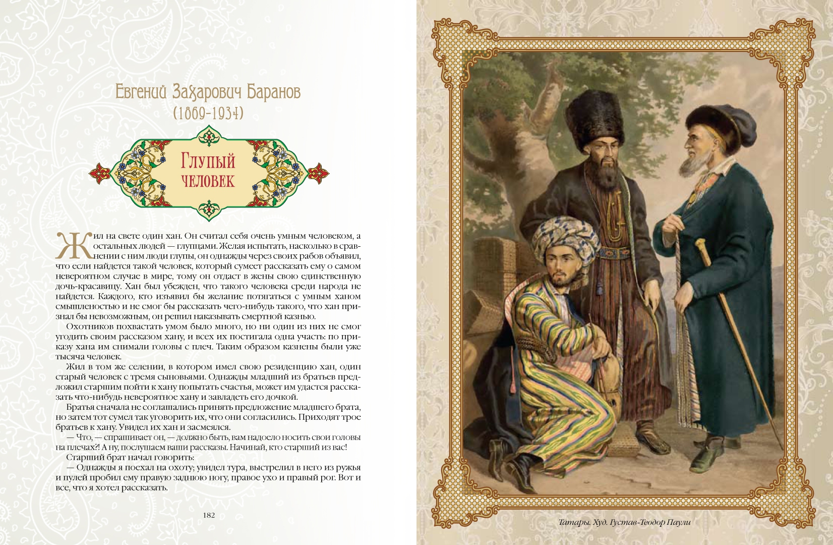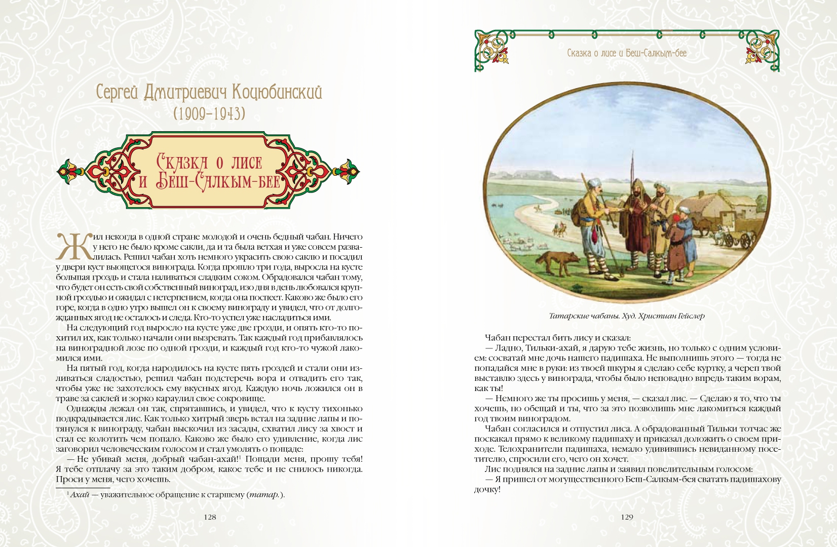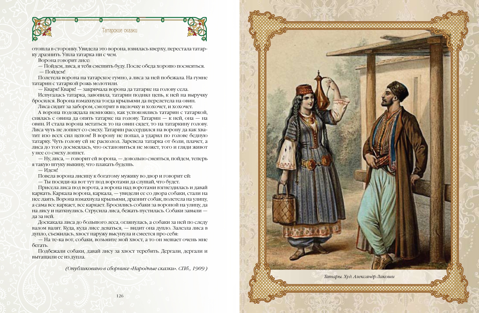 ОписаниеПредставляем вам уникальную антологию сказок, охватывающую все грани самобытного и яркого татарского фольклора. В этом роскошном издании собраны лучшие образцы произведений народного творчества поволжских, сибирских, горских и крымских татар.Сорок две сказки, вошедшие в эту книгу, были записаны в XIX - начале XX века со слов народных сказителей фольклористами и этнографами, а также школьными учителями и представителями национальной интеллигенции, затем переведены, адаптированы для детского чтения и художественно оформлены замечательными переводчиками и лингвистами П. А. Поляковым, В. Н. Харузиной, Е. З. Барановым, В. А. Гатцуком, С. Д. Коцюбинским, В. Х. Кондараки и другими.Большинство этих сказок публикуется в России впервые почти за полтора столетия, а в виде единого собрания, иллюстрированного произведениями татарской и мировой живописи, они не печатались ни разу.Завораживающий мир татарских сказок покоряет своей самобытностью, бесконечным разнообразием жанров и сюжетов, яркостью образов, богатством вымысла и неистощимостью народной фантазии.Редактор-составитель С. З. Кодзова.СвернутьПредставляем вам уникальную антологию сказок, охватывающую все грани самобытного и яркого татарского фольклора. В этом роскошном издании собраны лучшие образцы произведений народного творчества поволжских, сибирских, горских и крымских татар.Сорок две сказки, вошедшие в эту книгу, были записаны в XIX - начале XX века со слов народных сказителей фольклористами и этнографами, а также школьными учителями и представителями национальной интеллигенции, затем переведены, адаптированы для детского чтения и художественно оформлены замечательными переводчиками и лингвистами П. А. Поляковым, В. Н. Харузиной, Е. З. Барановым, В. А. Гатцуком, С. Д. Коцюбинским, В. Х. Кондараки и другими.Большинство этих сказок публикуется в России впервые почти за полтора столетия, а в виде единого собрания, иллюстрированного произведениями татарской и мировой живописи, они не печатались ни разу.Завораживающий мир татарских сказок покоряет своей самобытностью, бесконечным разнообразием жанров и сюжетов, яркостью образов, богатством вымысла и неистощимостью народной фантазии.Редактор-составитель С. З. Кодзова.СвернутьСвернуть