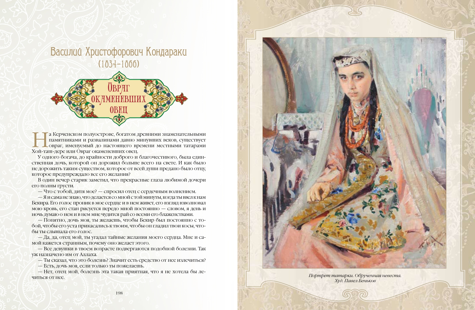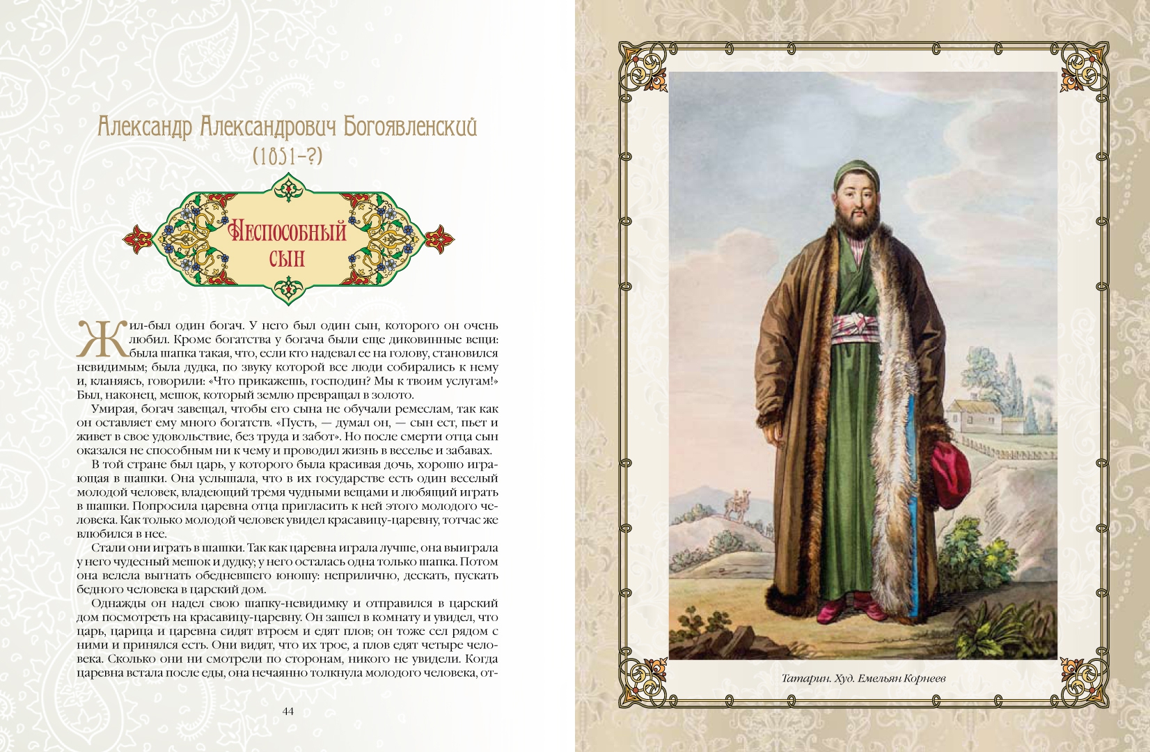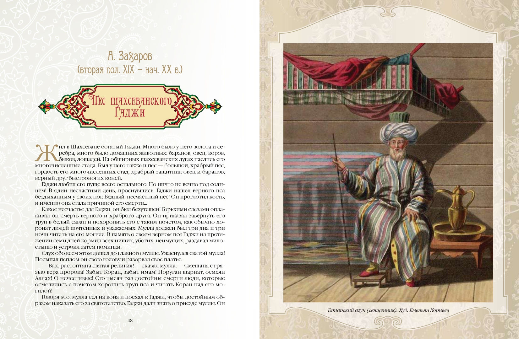 ОписаниеПредставляем вам уникальную антологию сказок, охватывающую все грани самобытного и яркого татарского фольклора. В этом роскошном издании собраны лучшие образцы произведений народного творчества поволжских, сибирских, горских и крымских татар.Сорок две сказки, вошедшие в эту книгу, были записаны в XIX - начале XX века со слов народных сказителей фольклористами и этнографами, а также школьными учителями и представителями национальной интеллигенции, затем переведены, адаптированы для детского чтения и художественно оформлены замечательными переводчиками и лингвистами П. А. Поляковым, В. Н. Харузиной, Е. З. Барановым, В. А. Гатцуком, С. Д. Коцюбинским, В. Х. Кондараки и другими.Большинство этих сказок публикуется в России впервые почти за полтора столетия, а в виде единого собрания, иллюстрированного произведениями татарской и мировой живописи, они не печатались ни разу.Завораживающий мир татарских сказок покоряет своей самобытностью, бесконечным разнообразием жанров и сюжетов, яркостью образов, богатством вымысла и неистощимостью народной фантазии.Редактор-составитель С. З. Кодзова.СвернутьПредставляем вам уникальную антологию сказок, охватывающую все грани самобытного и яркого татарского фольклора. В этом роскошном издании собраны лучшие образцы произведений народного творчества поволжских, сибирских, горских и крымских татар.Сорок две сказки, вошедшие в эту книгу, были записаны в XIX - начале XX века со слов народных сказителей фольклористами и этнографами, а также школьными учителями и представителями национальной интеллигенции, затем переведены, адаптированы для детского чтения и художественно оформлены замечательными переводчиками и лингвистами П. А. Поляковым, В. Н. Харузиной, Е. З. Барановым, В. А. Гатцуком, С. Д. Коцюбинским, В. Х. Кондараки и другими.Большинство этих сказок публикуется в России впервые почти за полтора столетия, а в виде единого собрания, иллюстрированного произведениями татарской и мировой живописи, они не печатались ни разу.Завораживающий мир татарских сказок покоряет своей самобытностью, бесконечным разнообразием жанров и сюжетов, яркостью образов, богатством вымысла и неистощимостью народной фантазии.Редактор-составитель С. З. Кодзова.СвернутьСвернуть