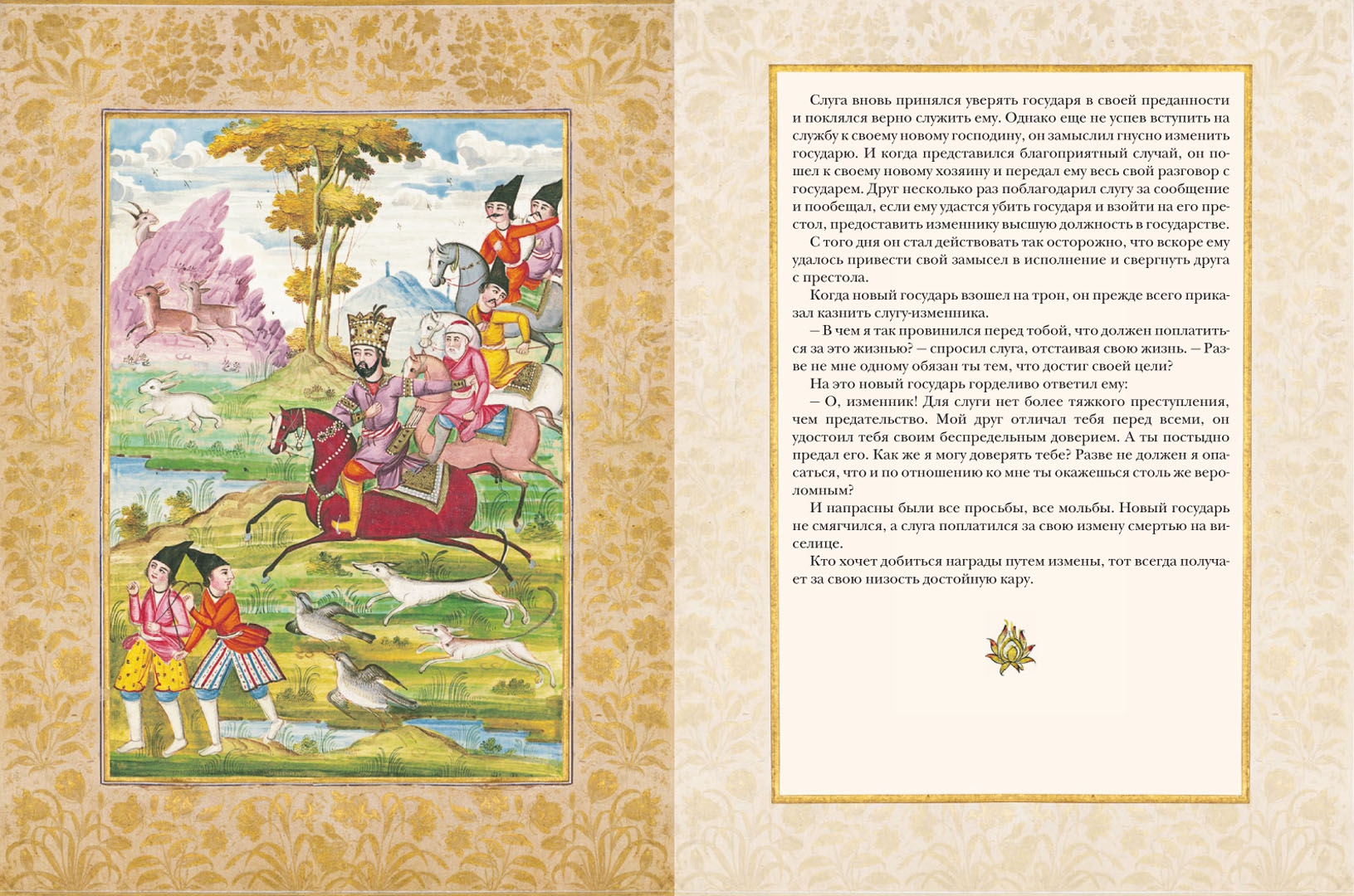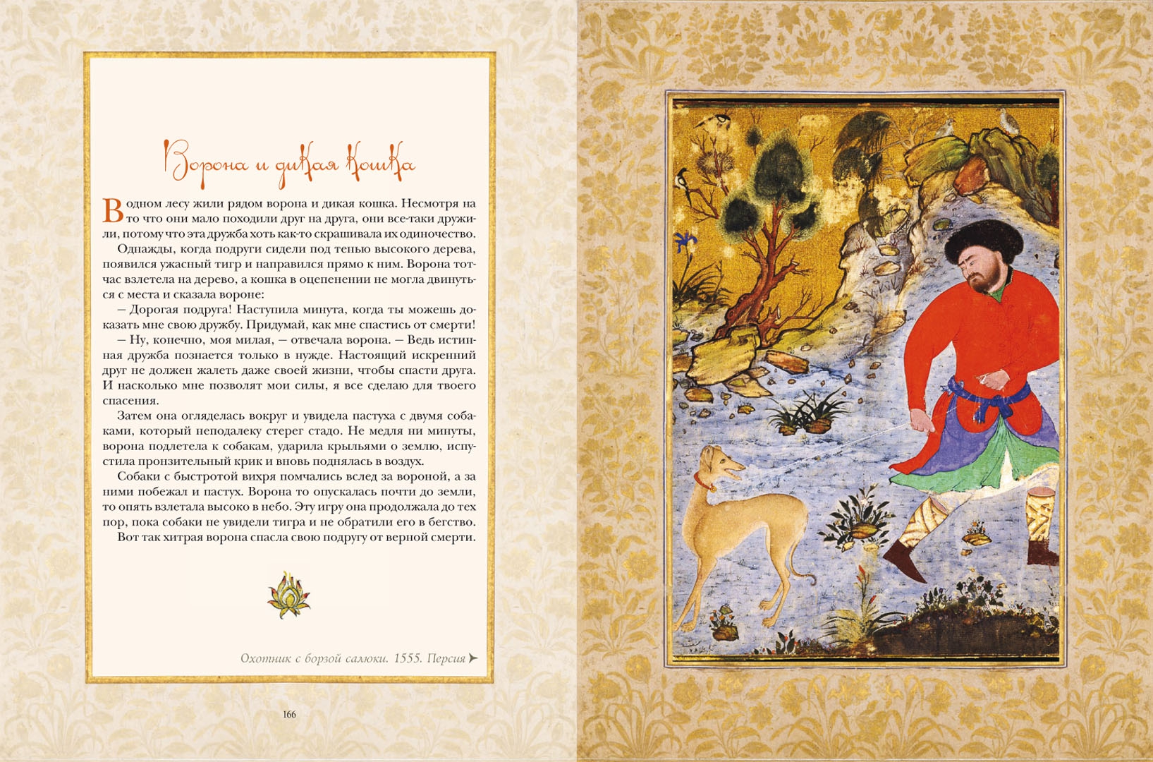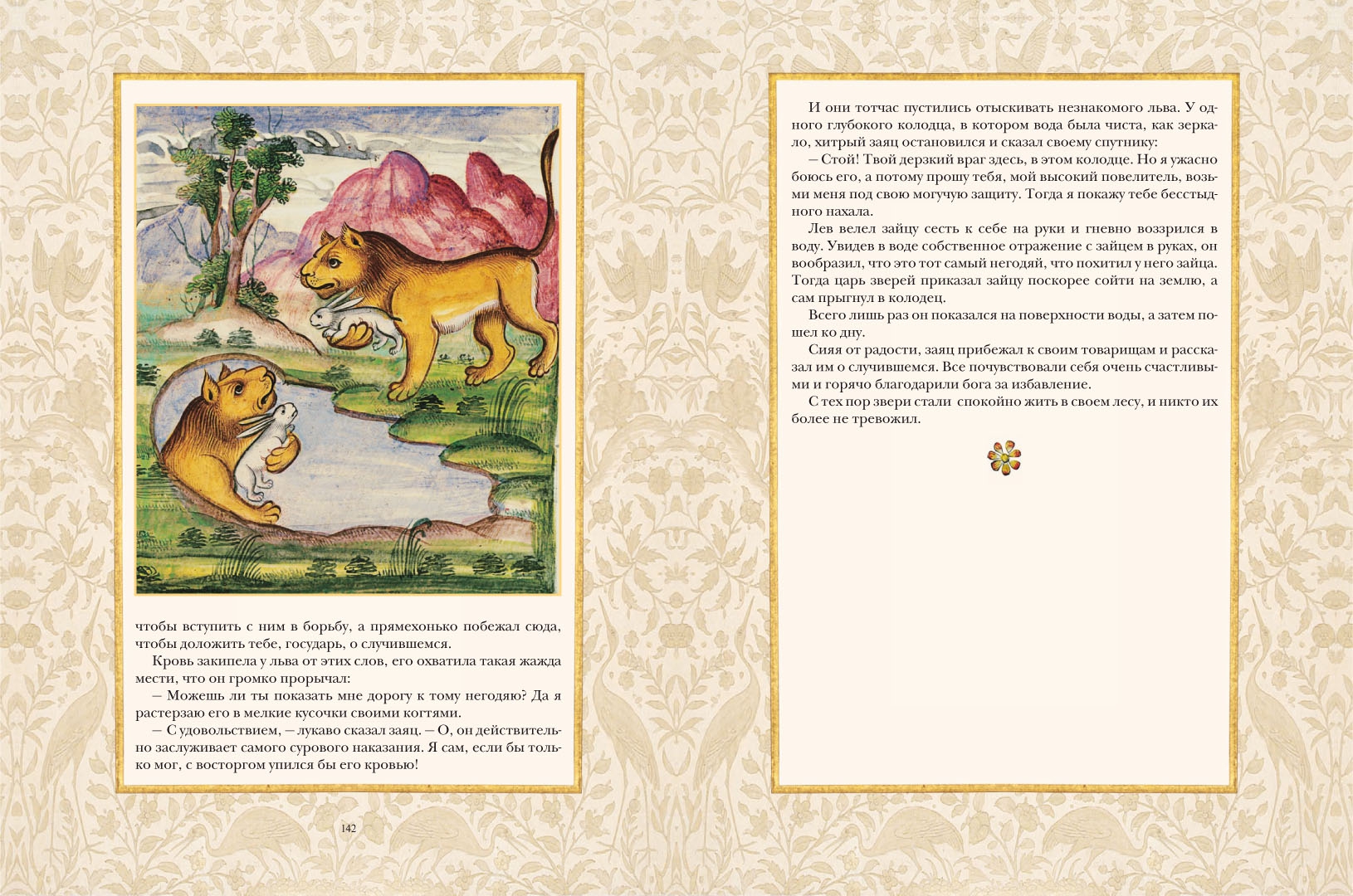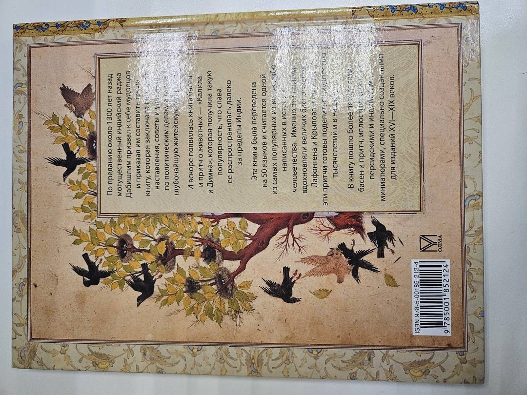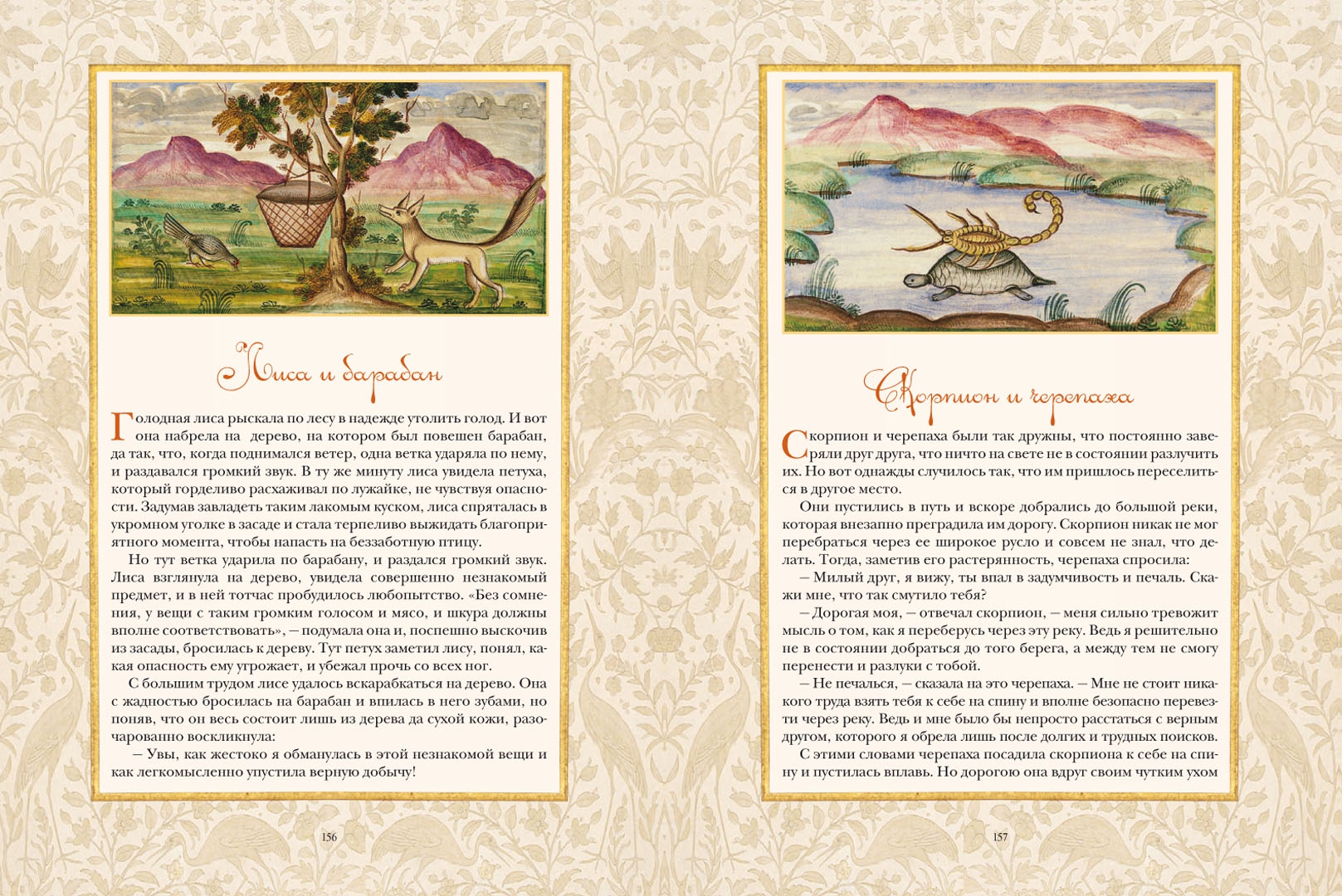 ОписаниеПо преданию около 1300 лет назад могущественный индийский раджа Дабишлим призвал к себе мудрецов и приказал им составить такую книгу, которая заключала бы в себе наставления, советы и указания по политическим делам, а также глубочайшую житейскую мудрость.И вскоре появилась книга басен и притч о животных - "Калила и Димна", которая получила такую популярность, что слава ее распространилась далеко за пределы Индии.Эта книга была переведена на 50 языков и считается одной из самых популярных из когда-либо написанных в истории человечества. Именно эти притчи вдохновляли великих баснописцев Лафонтена и Крылова и именно эти притчи готовы поделиться мудростью тысячелетий и в наши дни.В книгу вошло более пятидесяти басен и притч, иллюстрированных персидскими и индийскими миниатюрами, специально созданными для изданий XVI - XIX веков.По преданию около 1300 лет назад могущественный индийский раджа Дабишлим призвал к себе мудрецов и приказал им составить такую книгу, которая заключала бы в себе наставления, советы и указания по политическим делам, а также глубочайшую житейскую мудрость.И вскоре появилась книга басен и притч о животных - "Калила и Димна", которая получила такую популярность, что слава ее распространилась далеко за пределы Индии.Эта книга была переведена на 50 языков и считается одной из самых популярных из когда-либо написанных в истории человечества. Именно эти притчи вдохновляли великих баснописцев Лафонтена и Крылова и именно эти притчи готовы поделиться мудростью тысячелетий и в наши дни.В книгу вошло более пятидесяти басен и притч, иллюстрированных персидскими и индийскими миниатюрами, специально созданными для изданий XVI - XIX веков.