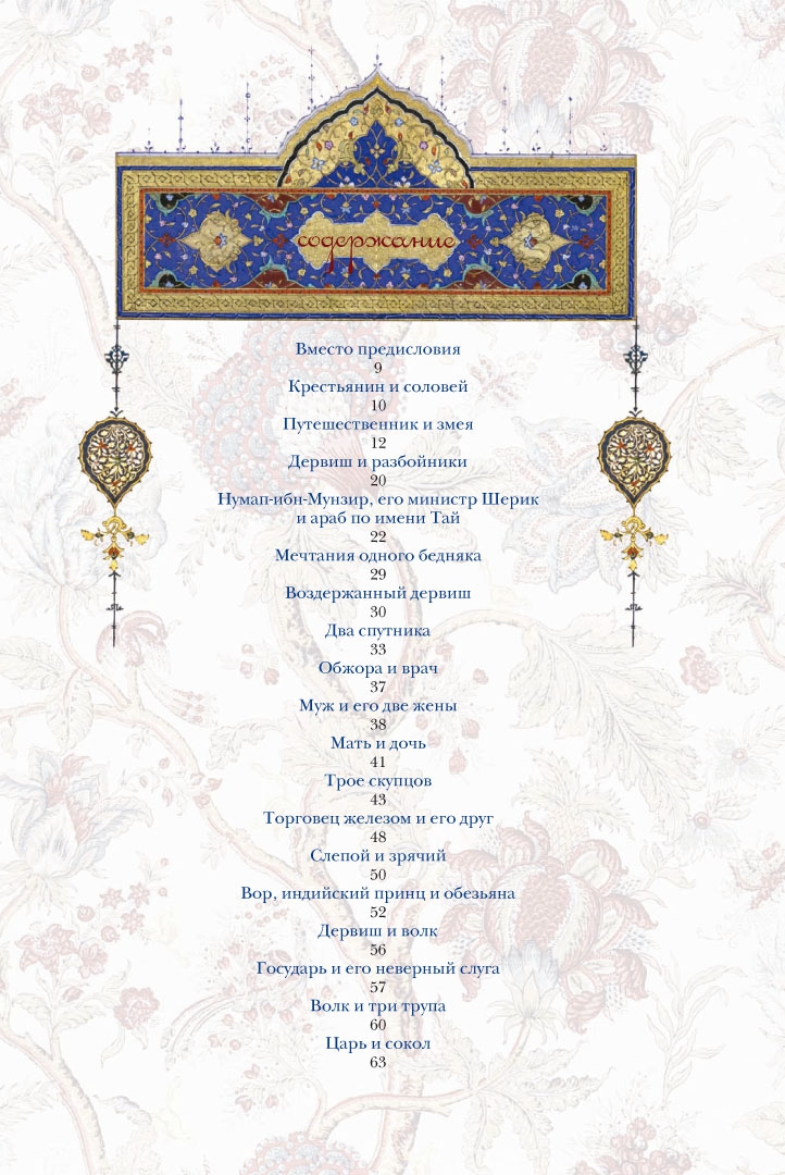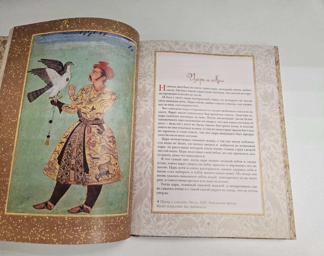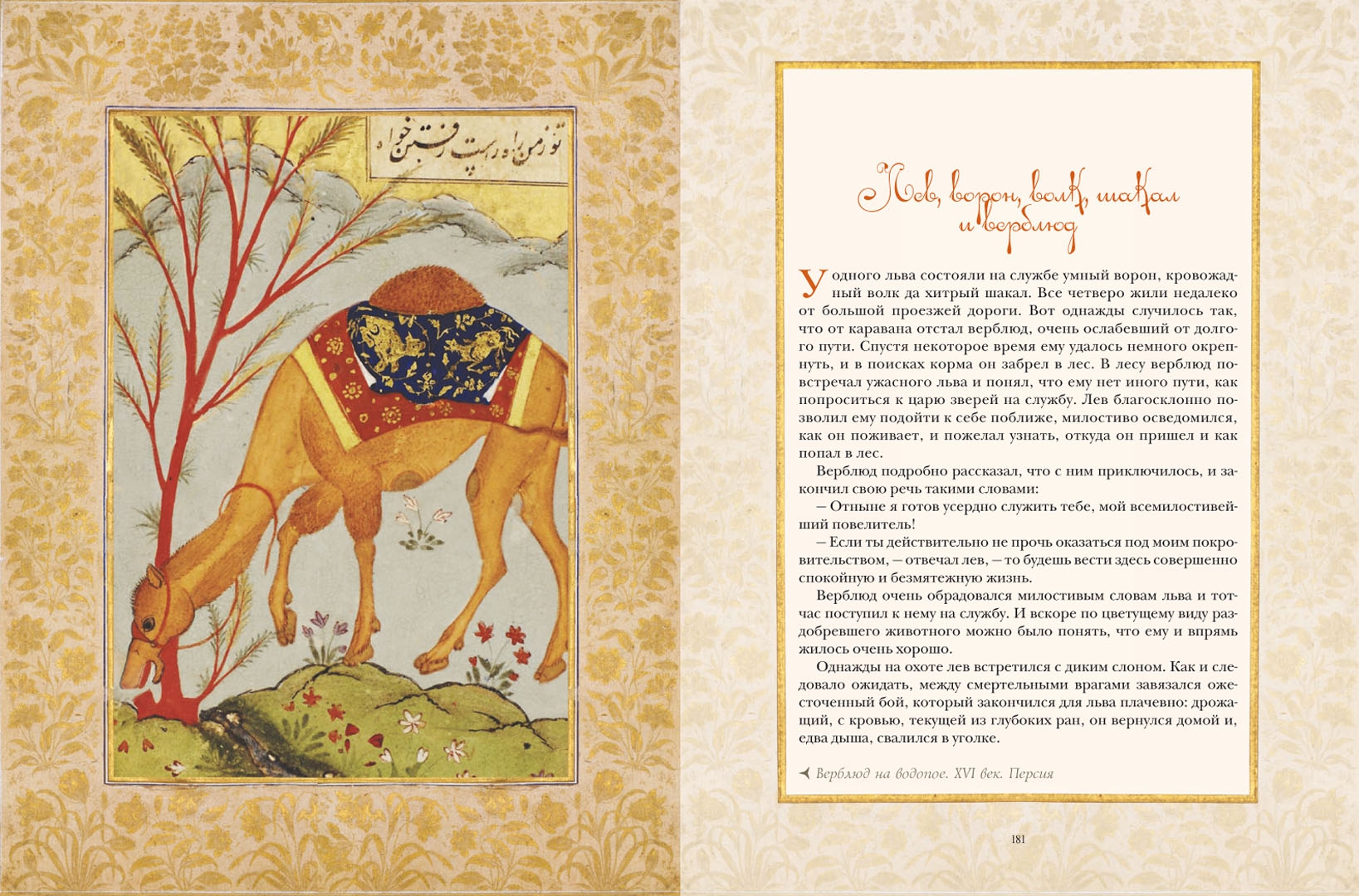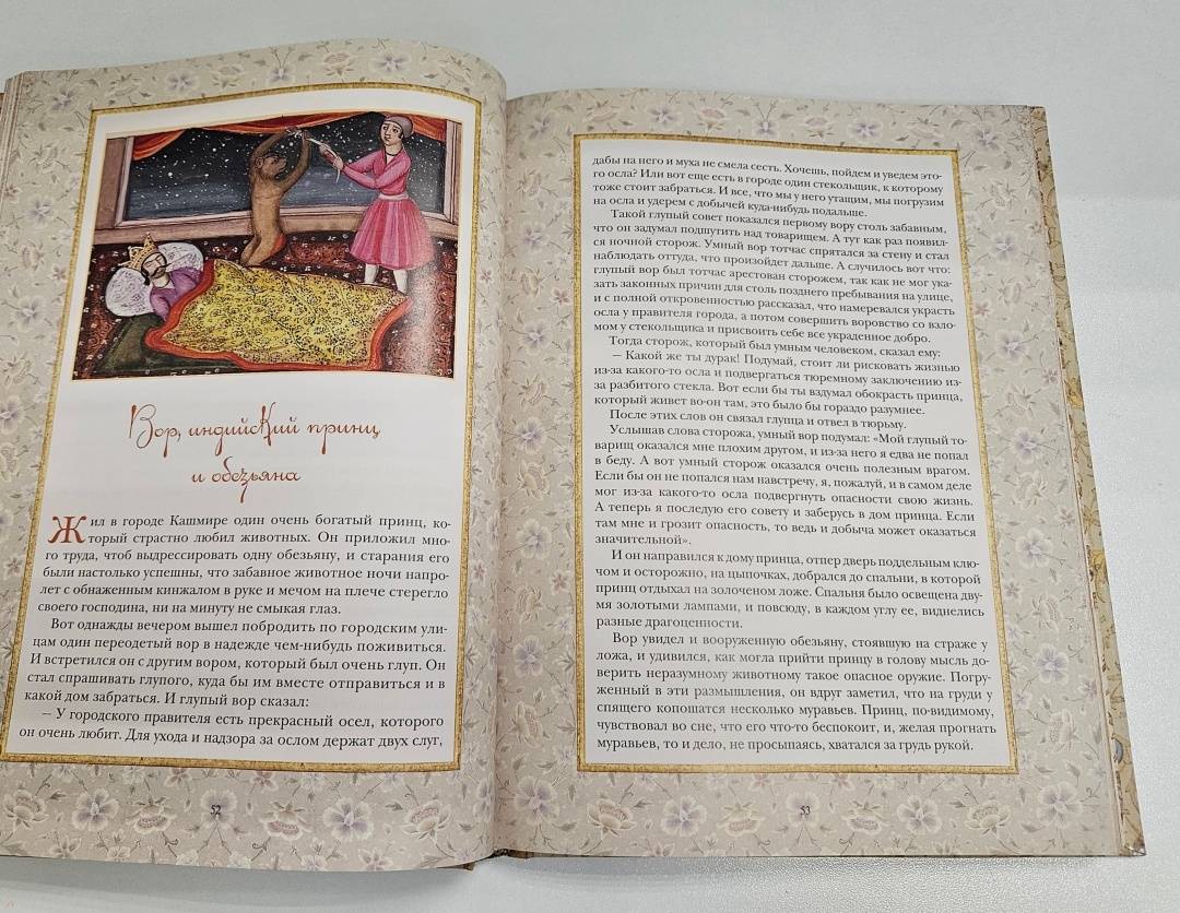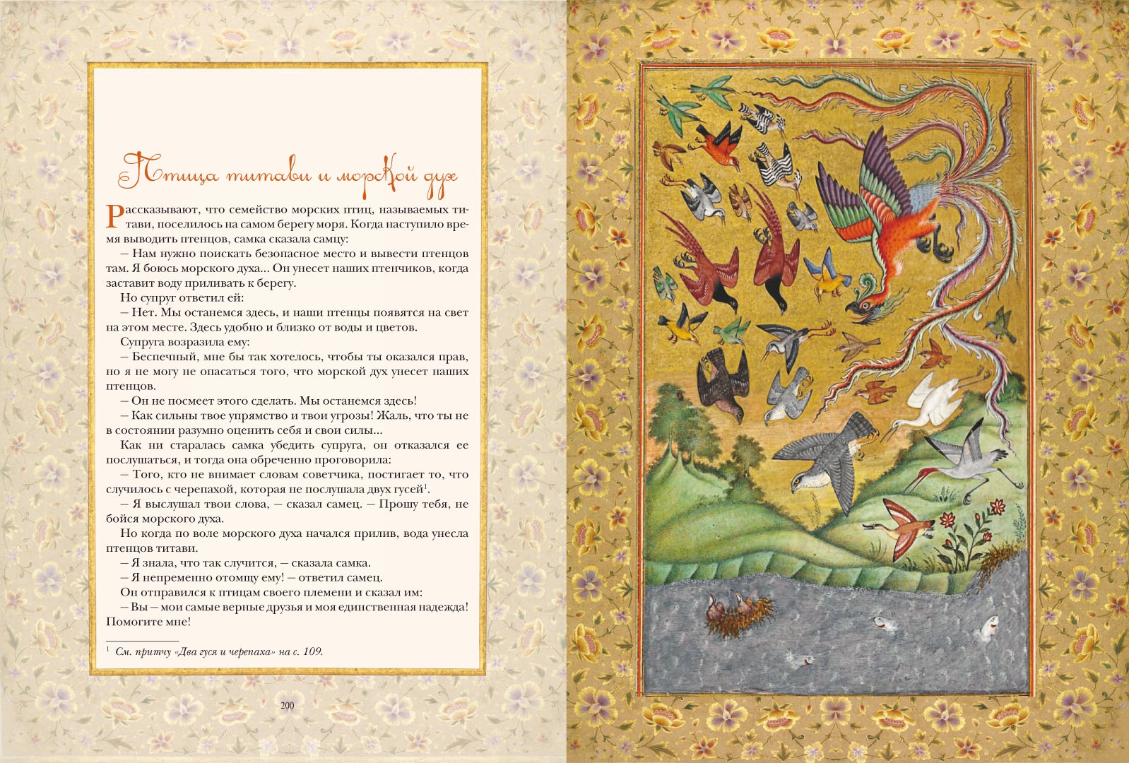ОписаниеПо преданию около 1300 лет назад могущественный индийский раджа Дабишлим призвал к себе мудрецов и приказал им составить такую книгу, которая заключала бы в себе наставления, советы и указания по политическим делам, а также глубочайшую житейскую мудрость.И вскоре появилась книга басен и притч о животных - "Калила и Димна", которая получила такую популярность, что слава ее распространилась далеко за пределы Индии.Эта книга была переведена на 50 языков и считается одной из самых популярных из когда-либо написанных в истории человечества. Именно эти притчи вдохновляли великих баснописцев Лафонтена и Крылова и именно эти притчи готовы поделиться мудростью тысячелетий и в наши дни.В книгу вошло более пятидесяти басен и притч, иллюстрированных персидскими и индийскими миниатюрами, специально созданными для изданий XVI - XIX веков.По преданию около 1300 лет назад могущественный индийский раджа Дабишлим призвал к себе мудрецов и приказал им составить такую книгу, которая заключала бы в себе наставления, советы и указания по политическим делам, а также глубочайшую житейскую мудрость.И вскоре появилась книга басен и притч о животных - "Калила и Димна", которая получила такую популярность, что слава ее распространилась далеко за пределы Индии.Эта книга была переведена на 50 языков и считается одной из самых популярных из когда-либо написанных в истории человечества. Именно эти притчи вдохновляли великих баснописцев Лафонтена и Крылова и именно эти притчи готовы поделиться мудростью тысячелетий и в наши дни.В книгу вошло более пятидесяти басен и притч, иллюстрированных персидскими и индийскими миниатюрами, специально созданными для изданий XVI - XIX веков.
