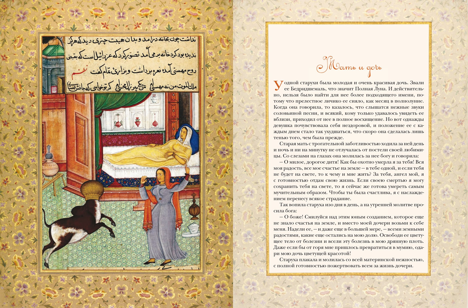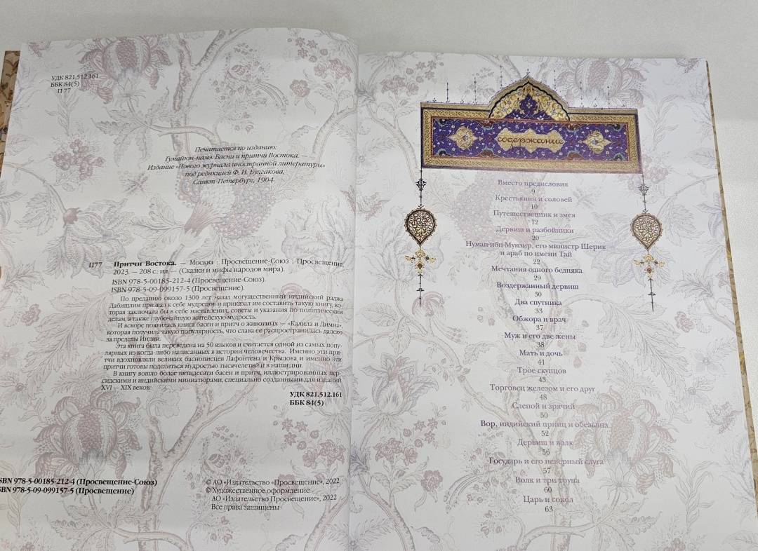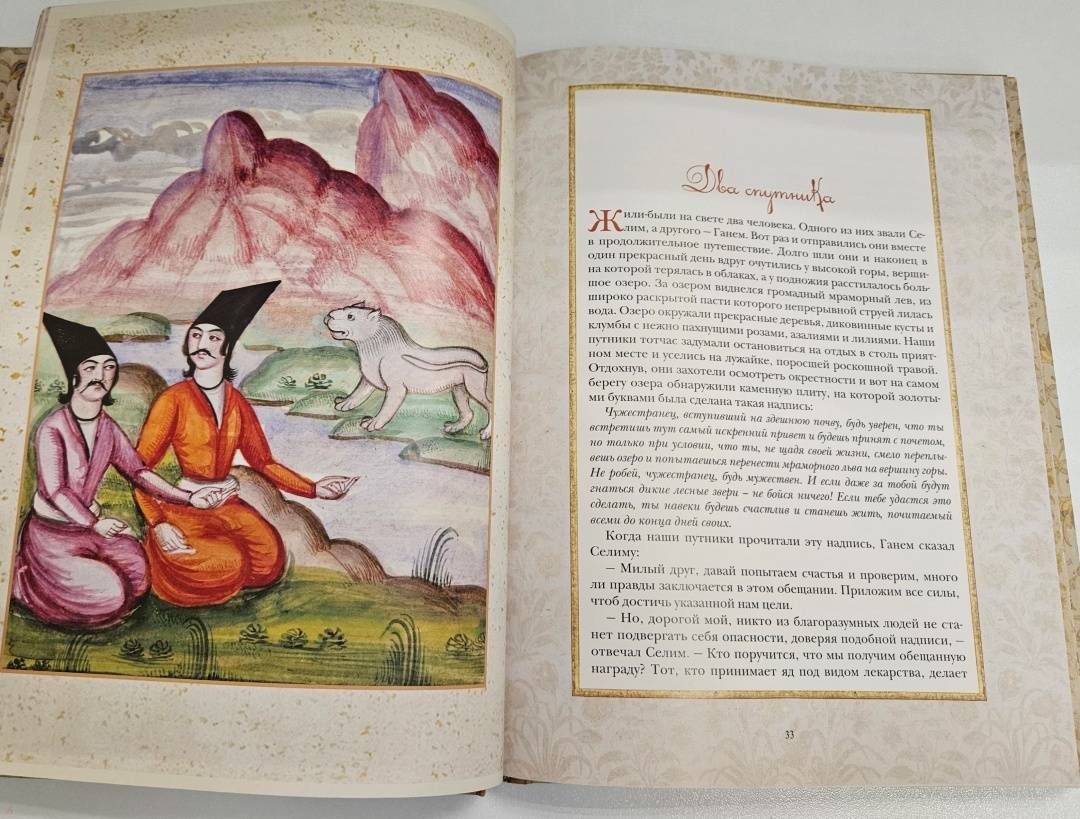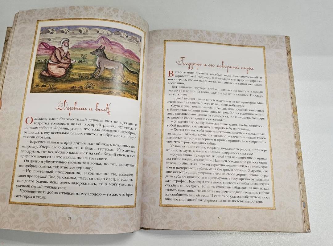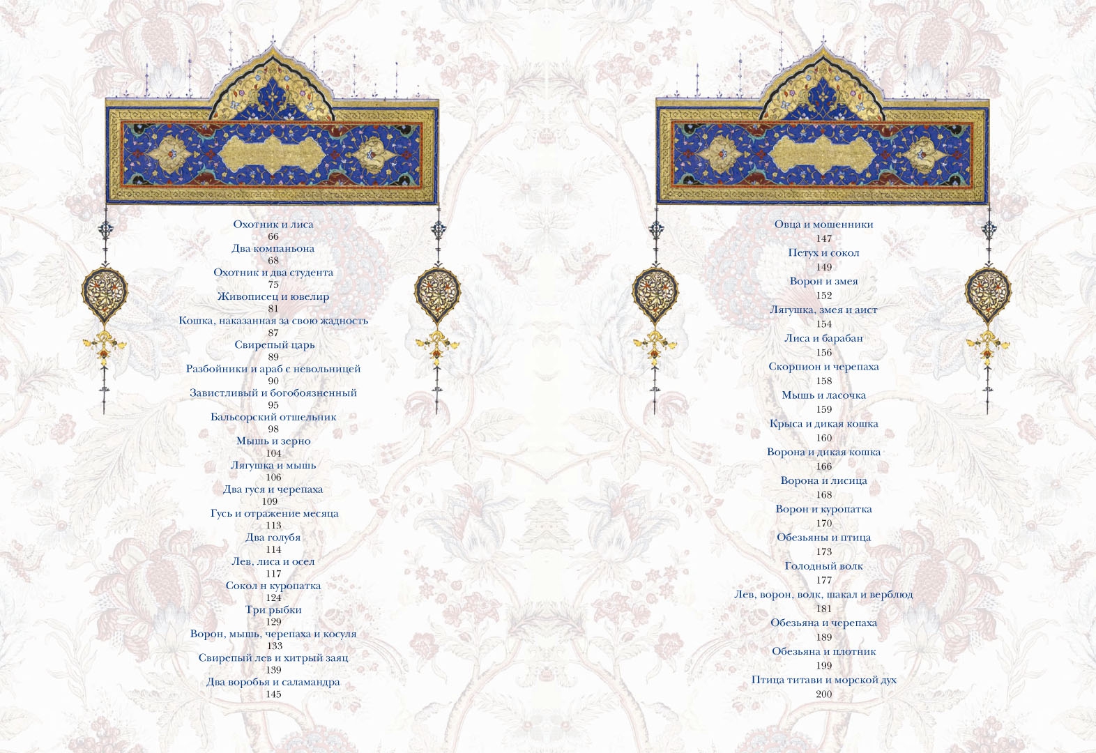 ОписаниеПо преданию около 1300 лет назад могущественный индийский раджа Дабишлим призвал к себе мудрецов и приказал им составить такую книгу, которая заключала бы в себе наставления, советы и указания по политическим делам, а также глубочайшую житейскую мудрость.И вскоре появилась книга басен и притч о животных - "Калила и Димна", которая получила такую популярность, что слава ее распространилась далеко за пределы Индии.Эта книга была переведена на 50 языков и считается одной из самых популярных из когда-либо написанных в истории человечества. Именно эти притчи вдохновляли великих баснописцев Лафонтена и Крылова и именно эти притчи готовы поделиться мудростью тысячелетий и в наши дни.В книгу вошло более пятидесяти басен и притч, иллюстрированных персидскими и индийскими миниатюрами, специально созданными для изданий XVI - XIX веков.По преданию около 1300 лет назад могущественный индийский раджа Дабишлим призвал к себе мудрецов и приказал им составить такую книгу, которая заключала бы в себе наставления, советы и указания по политическим делам, а также глубочайшую житейскую мудрость.И вскоре появилась книга басен и притч о животных - "Калила и Димна", которая получила такую популярность, что слава ее распространилась далеко за пределы Индии.Эта книга была переведена на 50 языков и считается одной из самых популярных из когда-либо написанных в истории человечества. Именно эти притчи вдохновляли великих баснописцев Лафонтена и Крылова и именно эти притчи готовы поделиться мудростью тысячелетий и в наши дни.В книгу вошло более пятидесяти басен и притч, иллюстрированных персидскими и индийскими миниатюрами, специально созданными для изданий XVI - XIX веков.