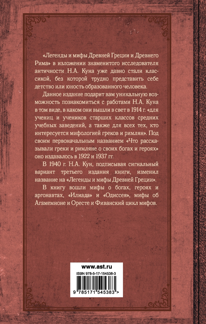 Описание"Легенды и мифы Древней Греции" в изложении знаменитого исследователя античности Н.А. Куна уже давно стали классикой, без которой трудно представить себе детство или юность образованного человека. Данное издание подарит вам уникальную возможность познакомиться с работами Н.А. Куна в том виде, в каком они вышли в свет в 1914 г. "для учениц и учеников старших классов средних учебных заведений, а также для всех тех, кто интересуется мифологией греков и римлян". Под своим первоначальным названием "Что рассказывали греки и римляне о своих богах и героях" оно издавалось в 1922 г. и 1937 г.В 1940 г. Н.А. Кун, подписывая сигнальный вариант третьего издания книги, изменил название на "Легенды и мифы Древней Греции".В книгу вошли мифы о богах, героях и аргонавтах, Илиада и Одиссея, мифы об Агамемноне и Оресте и Фиванский цикл мифов."Легенды и мифы Древней Греции" в изложении знаменитого исследователя античности Н.А. Куна уже давно стали классикой, без которой трудно представить себе детство или юность образованного человека. Данное издание подарит вам уникальную возможность познакомиться с работами Н.А. Куна в том виде, в каком они вышли в свет в 1914 г. "для учениц и учеников старших классов средних учебных заведений, а также для всех тех, кто интересуется мифологией греков и римлян". Под своим первоначальным названием "Что рассказывали греки и римляне о своих богах и героях" оно издавалось в 1922 г. и 1937 г.В 1940 г. Н.А. Кун, подписывая сигнальный вариант третьего издания книги, изменил название на "Легенды и мифы Древней Греции".В книгу вошли мифы о богах, героях и аргонавтах, Илиада и Одиссея, мифы об Агамемноне и Оресте и Фиванский цикл мифов.