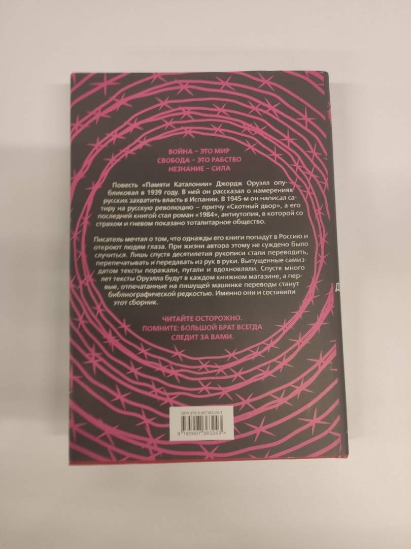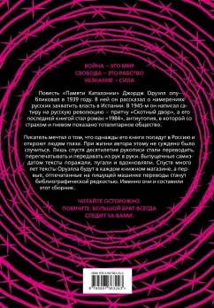 ОписаниеПовесть "Памяти Каталонии" Джордж Оруэлл опубликовал в 1939 году. В ней он рассказал о намерениях русских захватить власть в Испании. В 1945 он написал сатиру на русскую революцию - притчу "Скотный двор", а его последней книгой стал роман "1984", антиутопия, в которой со страхом и гневом показано тоталитарное общество. Писатель мечтал о том, что однажды его книги попадут в Россию и откроют людям глаза. При жизни автора этому не суждено было случиться. Лишь спустя десятилетия рукописи стали переводить, перепечатывать и передавать из рук в руки. Выпущенные самиздатом тексты поражали, пугали и вдохновляли. Спустя много лет тексты Оруэлла будут в каждом книжном магазине, а первые, отпечатанные на пишущей машинке, переводы станут библиографической редкостью. Именно они и составили этот сборник. Читайте осторожно. Помните, Большой брат всегда следит за вами.Повесть "Памяти Каталонии" Джордж Оруэлл опубликовал в 1939 году. В ней он рассказал о намерениях русских захватить власть в Испании. В 1945 он написал сатиру на русскую революцию - притчу "Скотный двор", а его последней книгой стал роман "1984", антиутопия, в которой со страхом и гневом показано тоталитарное общество. Писатель мечтал о том, что однажды его книги попадут в Россию и откроют людям глаза. При жизни автора этому не суждено было случиться. Лишь спустя десятилетия рукописи стали переводить, перепечатывать и передавать из рук в руки. Выпущенные самиздатом тексты поражали, пугали и вдохновляли. Спустя много лет тексты Оруэлла будут в каждом книжном магазине, а первые, отпечатанные на пишущей машинке, переводы станут библиографической редкостью. Именно они и составили этот сборник. Читайте осторожно. Помните, Большой брат всегда следит за вами.
