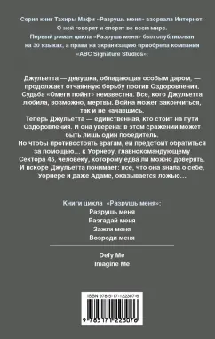ОписаниеДжульетта – девушка, обладающая особым даром, – продолжает отчаянную борьбу против Оздоровления.Судьба «Омеги пойнт» неизвестна. Все, кого Джульетта любила, возможно, мертвы. Война может закончиться, так и не начавшись.Теперь Джульетта – единственная, кто стоит на пути Оздоровления. И она уверена: в этом сражении может быть лишь один победитель.Но чтобы противостоять врагам, ей предстоит обратиться за помощью… к Уорнеру, главнокомандующему Сектора 45, человеку, которому едва ли можно доверять. И вскоре Джульетта понимает: все, что она знала о себе, Уорнере и даже Адаме, оказывается ложью…Джульетта – девушка, обладающая особым даром, – продолжает отчаянную борьбу против Оздоровления.Судьба «Омеги пойнт» неизвестна. Все, кого Джульетта любила, возможно, мертвы. Война может закончиться, так и не начавшись.Теперь Джульетта – единственная, кто стоит на пути Оздоровления. И она уверена: в этом сражении может быть лишь один победитель.Но чтобы противостоять врагам, ей предстоит обратиться за помощью… к Уорнеру, главнокомандующему Сектора 45, человеку, которому едва ли можно доверять. И вскоре Джульетта понимает: все, что она знала о себе, Уорнере и даже Адаме, оказывается ложью…