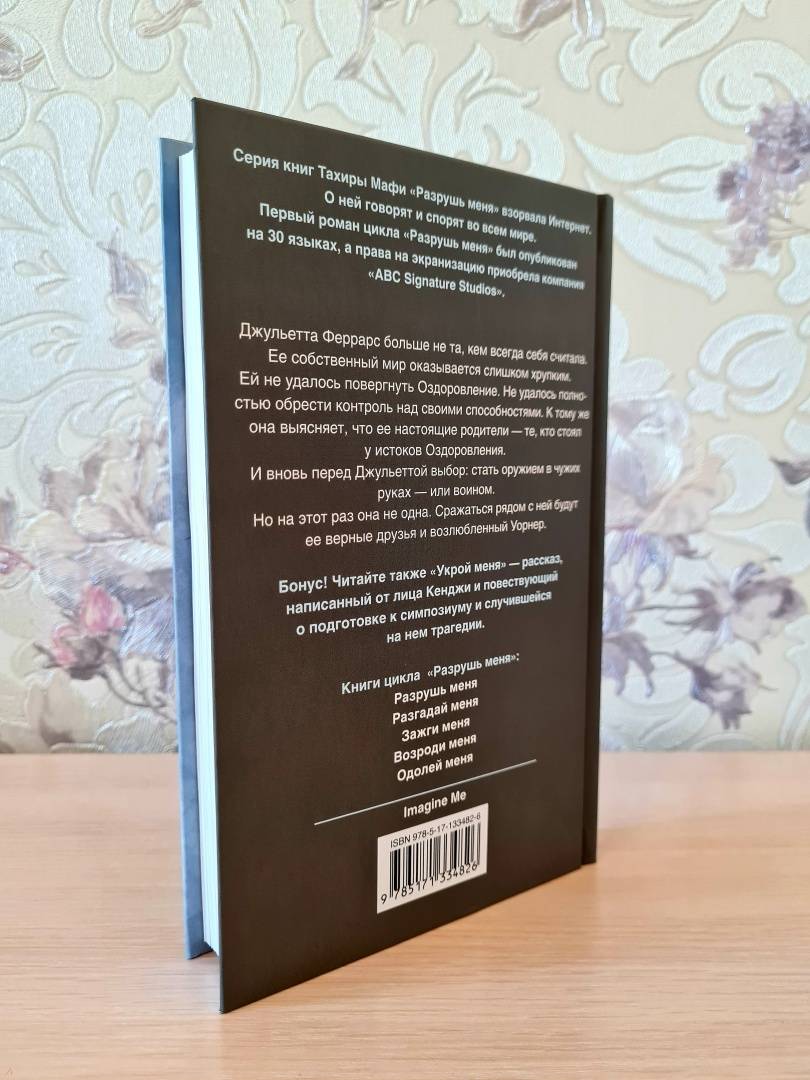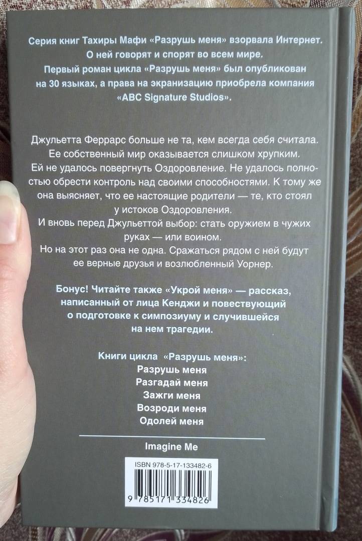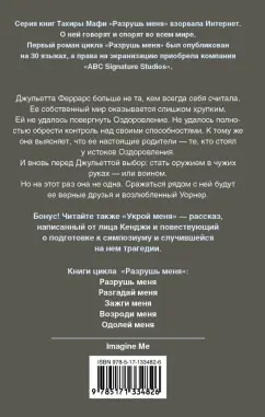 ОписаниеДжульетта Феррарс больше не та, кем всегда себя считала. Ее собственный мир оказывается слишком хрупким.Ей не удалось повергнуть Оздоровление. Не удалось полностью обрести контроль над своими способностями. К тому же она выясняет, что ее настоящие родители - те, кто стоял у истоков Оздоровления. И вновь перед Джульеттой выбор: стать оружием в чужих руках - или воином.Но на этот раз она не одна. Сражаться рядом с ней будут ее верные друзья и возлюбленный Уорнер.Бонус! Читайте также "Укрой меня" - рассказ, написанный от лица Кенджи и повествующий о подготовке к симпозиуму и случившейся на нем трагедии.Джульетта Феррарс больше не та, кем всегда себя считала. Ее собственный мир оказывается слишком хрупким.Ей не удалось повергнуть Оздоровление. Не удалось полностью обрести контроль над своими способностями. К тому же она выясняет, что ее настоящие родители - те, кто стоял у истоков Оздоровления. И вновь перед Джульеттой выбор: стать оружием в чужих руках - или воином.Но на этот раз она не одна. Сражаться рядом с ней будут ее верные друзья и возлюбленный Уорнер.Бонус! Читайте также "Укрой меня" - рассказ, написанный от лица Кенджи и повествующий о подготовке к симпозиуму и случившейся на нем трагедии.