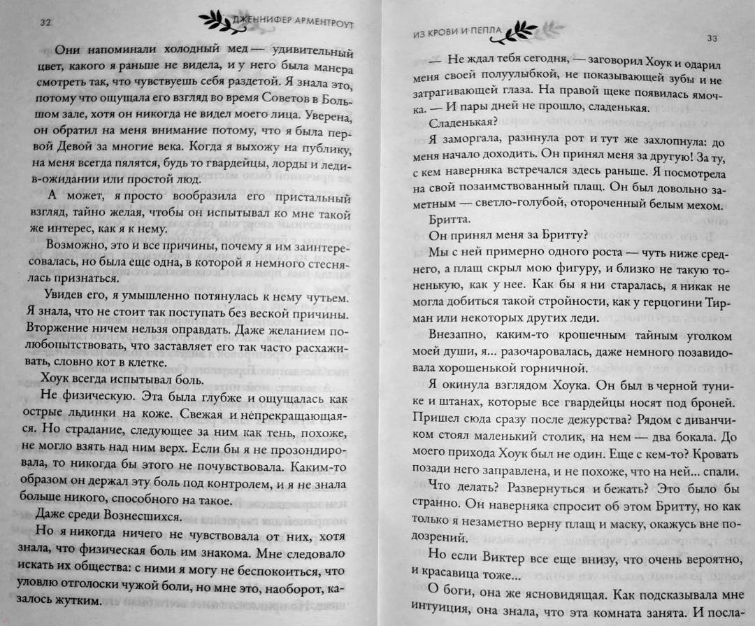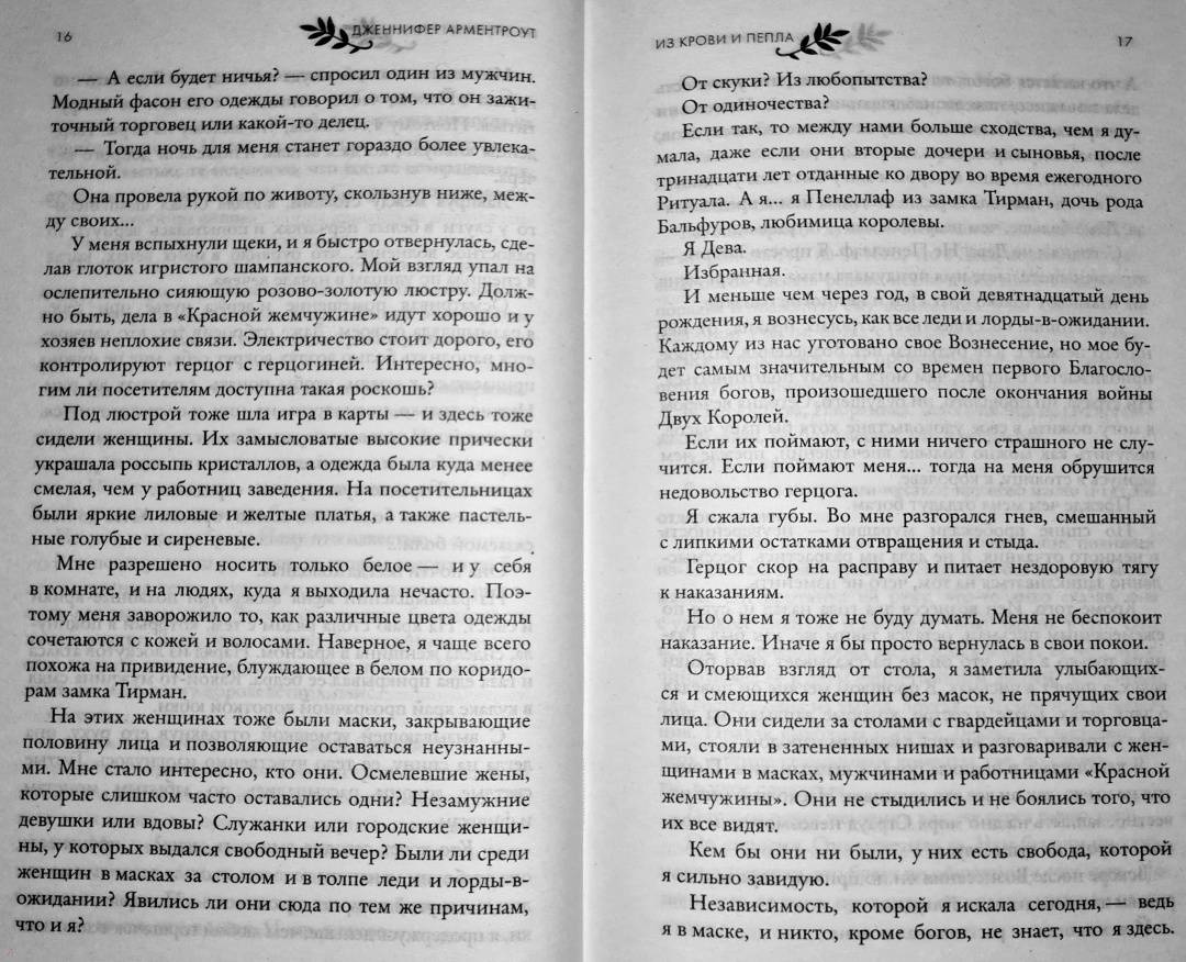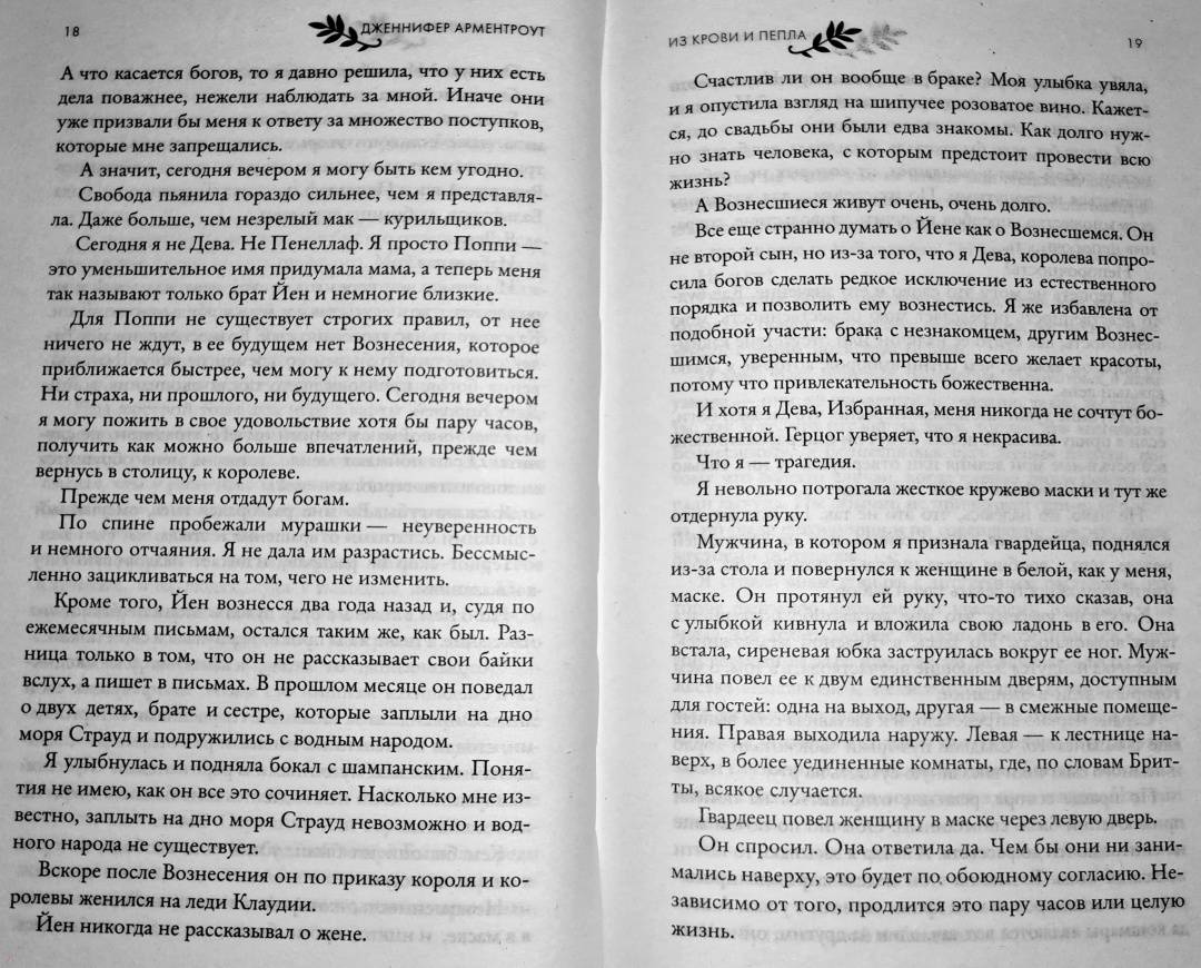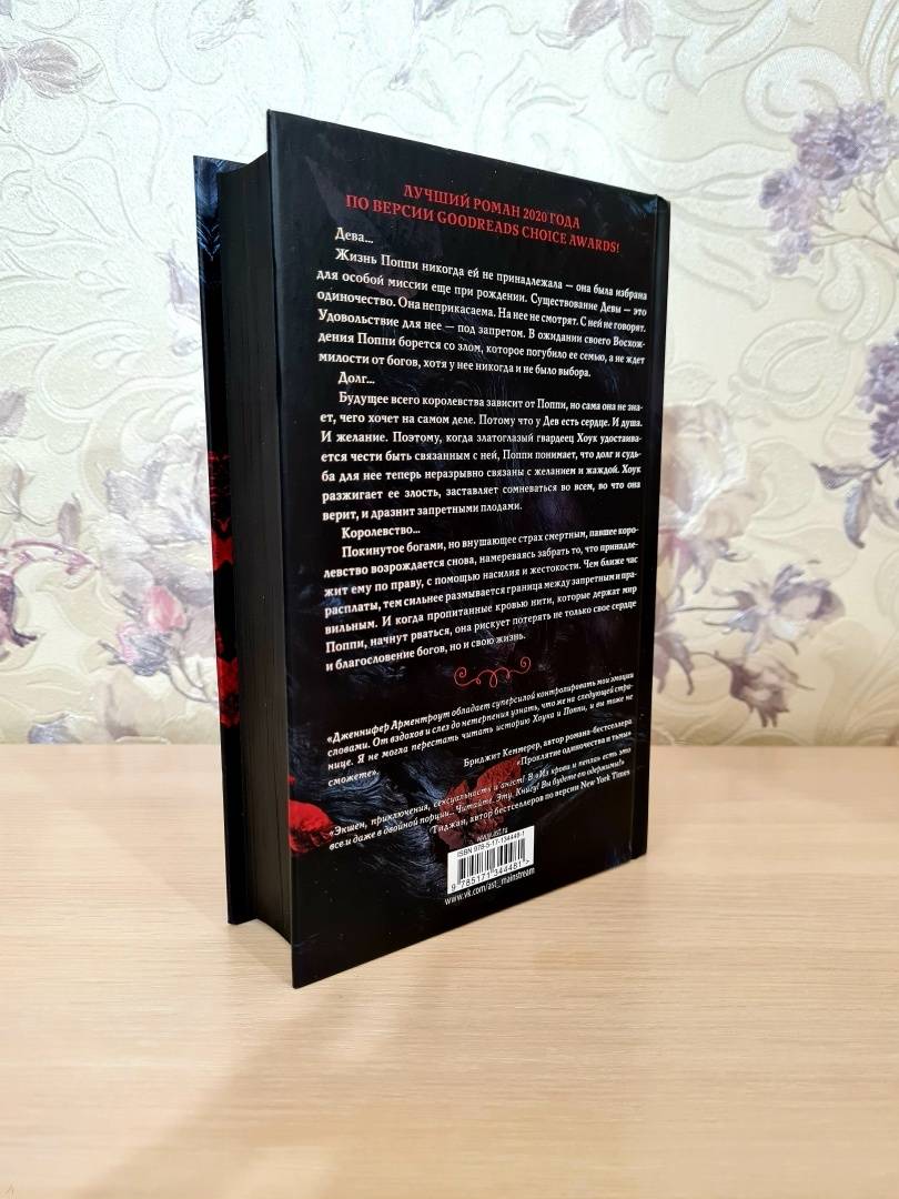 ОписаниеДева…Жизнь Поппи никогда ей не принадлежала - она была избрана для особой миссии еще при рождении. Жизнь Девы - это одиночество. Она неприкасаема. На нее не смотрят. С ней не говорят. Удовольствие для нее - под запретом. В ожидании своего Восхождения Поппи борется со злом, которое погубило ее семью, а не ждет милости от богов, хотя у нее никогда и не было выбора.Долг…Будущее всего королевства зависит от Поппи, но сама она не знает, чего хочет на самом деле. Потому что у Дев есть сердце. И душа. И желание. И когда златоглазый гвардеец Хоук удостаивается чести быть связанным с ней, Поппи понимает, что долг и судьба для нее теперь неразрывно связаны с желанием и жаждой. Хоук разжигает ее злость, заставляет сомневаться во всем, во что она верит, и дразнит запретными плодами.Королевство…Покинутое богами, но внушающее страх смертным, павшее королевство возрождается снова, намереваясь забрать то, что принадлежит ему по праву, с помощью насилия и жестокости. Чем ближе час расплаты, тем сильнее размывается граница между запретным и правильным. И когда пропитанные кровью нити, которые держат мир Поппи, начнут рваться, она рискует потерять не только свое сердце и благословение богов, но и свою жизнь."Дженнифер Арментроут обладает суперсилой контролировать мои эмоции словами. От вздохов и слез до нетерпения узнать, что же на следующей странице. Я не могла перестать читать историю Хоука и Поппи, и вы тоже не сможете". Бриджит Кеммерер, автор романа-бестселлера "Проклятие одиночества и тьмы""Экшн, приключения, сексуальность и ангст! В "Из крови и пепла" есть это все и даже в двойной порции… Читайте. Эту. Книгу! Вы будете ей одержимы!" Тиджан, автор бестселлеров по версии New York TimesСвернутьДева…Жизнь Поппи никогда ей не принадлежала - она была избрана для особой миссии еще при рождении. Жизнь Девы - это одиночество. Она неприкасаема. На нее не смотрят. С ней не говорят. Удовольствие для нее - под запретом. В ожидании своего Восхождения Поппи борется со злом, которое погубило ее семью, а не ждет милости от богов, хотя у нее никогда и не было выбора.Долг…Будущее всего королевства зависит от Поппи, но сама она не знает, чего хочет на самом деле. Потому что у Дев есть сердце. И душа. И желание. И когда златоглазый гвардеец Хоук удостаивается чести быть связанным с ней, Поппи понимает, что долг и судьба для нее теперь неразрывно связаны с желанием и жаждой. Хоук разжигает ее злость, заставляет сомневаться во всем, во что она верит, и дразнит запретными плодами.Королевство…Покинутое богами, но внушающее страх смертным, павшее королевство возрождается снова, намереваясь забрать то, что принадлежит ему по праву, с помощью насилия и жестокости. Чем ближе час расплаты, тем сильнее размывается граница между запретным и правильным. И когда пропитанные кровью нити, которые держат мир Поппи, начнут рваться, она рискует потерять не только свое сердце и благословение богов, но и свою жизнь."Дженнифер Арментроут обладает суперсилой контролировать мои эмоции словами. От вздохов и слез до нетерпения узнать, что же на следующей странице. Я не могла перестать читать историю Хоука и Поппи, и вы тоже не сможете". Бриджит Кеммерер, автор романа-бестселлера "Проклятие одиночества и тьмы""Экшн, приключения, сексуальность и ангст! В "Из крови и пепла" есть это все и даже в двойной пор