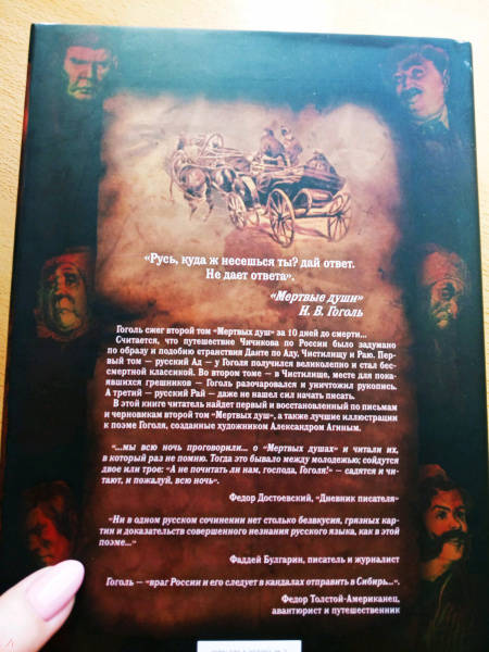 ОписаниеГоголь сжег второй том "Мертвых душ" за 10 дней до смерти... Считается, что путешествие Чичикова по России было задумано по образу и подобию странствия Данте по Аду, Чистилищу и Раю. Первый том - русский Ад - у Гоголя получился великолепно и стал бессмертной классикой. Во втором томе - в Чистилище, месте для покаявшихся грешников - Гоголь разочаровался и уничтожил рукопись. А третий - русский Рай - даже не нашел сил начать писать. Ни один просвещенный человек в России не остался равнодушен к новому произведению Гоголя, книга всех тронула, никого не оставила равнодушным. Да и в современной России нетрудно найти гоголевских персонажей. В этой книге читатель найдет первый и восстановленный по письмам и черновикам второй том "Мертвых душ", а также лучшие иллюстрации к поэме Гоголя, созданные художником Александром Агиным.Гоголь сжег второй том "Мертвых душ" за 10 дней до смерти... Считается, что путешествие Чичикова по России было задумано по образу и подобию странствия Данте по Аду, Чистилищу и Раю. Первый том - русский Ад - у Гоголя получился великолепно и стал бессмертной классикой. Во втором томе - в Чистилище, месте для покаявшихся грешников - Гоголь разочаровался и уничтожил рукопись. А третий - русский Рай - даже не нашел сил начать писать. Ни один просвещенный человек в России не остался равнодушен к новому произведению Гоголя, книга всех тронула, никого не оставила равнодушным. Да и в современной России нетрудно найти гоголевских персонажей. В этой книге читатель найдет первый и восстановленный по письмам и черновикам второй том "Мертвых душ", а также лучшие иллюстрации к поэме Гоголя, созданные художником Александром Агиным.