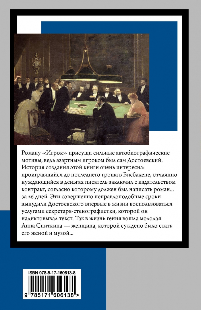 ОписаниеРоману "Игрок" присущи сильные автобиографические мотивы, ведь азартным игроком был сам Достоевский.История создания этой книги очень интересна: проигравшийся до последнего гроша в Висбадене, отчаянно нуждающийся в деньгах писатель заключил с издательством контракт, согласно которому должен был написать роман... за 26 дней. Эти совершенно неправдоподобные сроки вынудили Достоевского, впервые в жизни, воспользоваться услугами секретаря-стенографистки, которой он надиктовывал текст. Так в жизнь гения вошла молодая Анна Сниткина — женщина, которой суждено было стать его женой и музой...Роману "Игрок" присущи сильные автобиографические мотивы, ведь азартным игроком был сам Достоевский.История создания этой книги очень интересна: проигравшийся до последнего гроша в Висбадене, отчаянно нуждающийся в деньгах писатель заключил с издательством контракт, согласно которому должен был написать роман... за 26 дней. Эти совершенно неправдоподобные сроки вынудили Достоевского, впервые в жизни, воспользоваться услугами секретаря-стенографистки, которой он надиктовывал текст. Так в жизнь гения вошла молодая Анна Сниткина — женщина, которой суждено было стать его женой и музой...