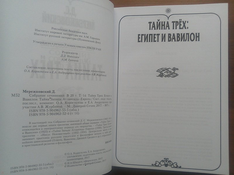 ОписаниеВ настоящий том Собрания сочинений Д. С. Мережковского (1865-1941) вошли две первые книги трилогии, имеющей общее название "Тайна Трех" и относящейся к эмигрантскому периоду его творчества, "Тайна Трех: Египет и Вавилон" (1925) и "Тайна Запада: Атлантида- Европа" (1930). Третья книга трилогии - "Иисус Неизвестный" (1932-1934). Центральное место в них занимает трактовка русским писателем и философом загадок и тайн древнейших цивилизаций (Египта, Вавилона, Древней Греции и др.), отразившихся в христианской религии и философии.В настоящий том Собрания сочинений Д. С. Мережковского (1865-1941) вошли две первые книги трилогии, имеющей общее название "Тайна Трех" и относящейся к эмигрантскому периоду его творчества, "Тайна Трех: Египет и Вавилон" (1925) и "Тайна Запада: Атлантида- Европа" (1930). Третья книга трилогии - "Иисус Неизвестный" (1932-1934). Центральное место в них занимает трактовка русским писателем и философом загадок и тайн древнейших цивилизаций (Египта, Вавилона, Древней Греции и др.), отразившихся в христианской религии и философии.