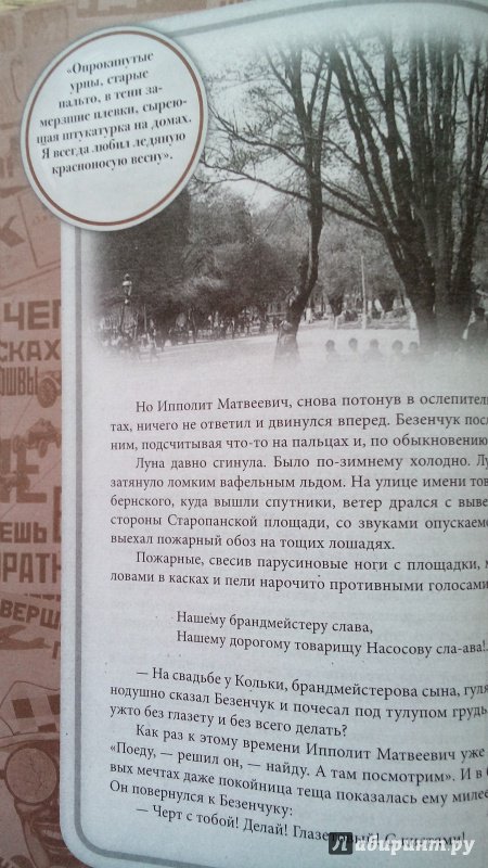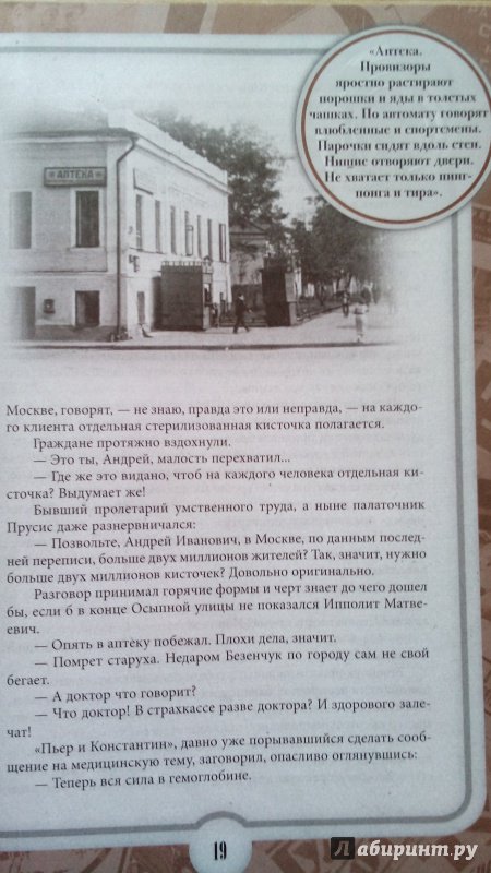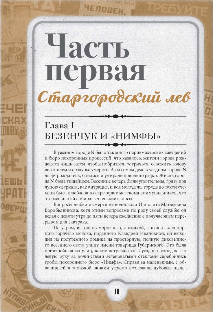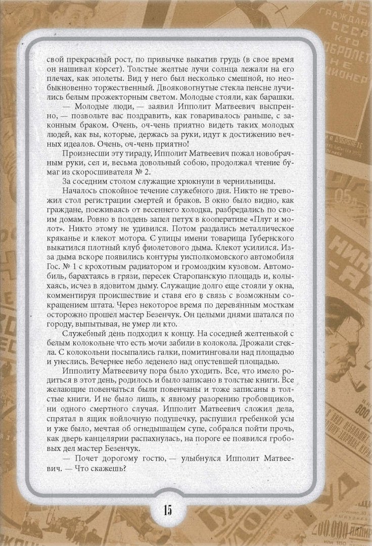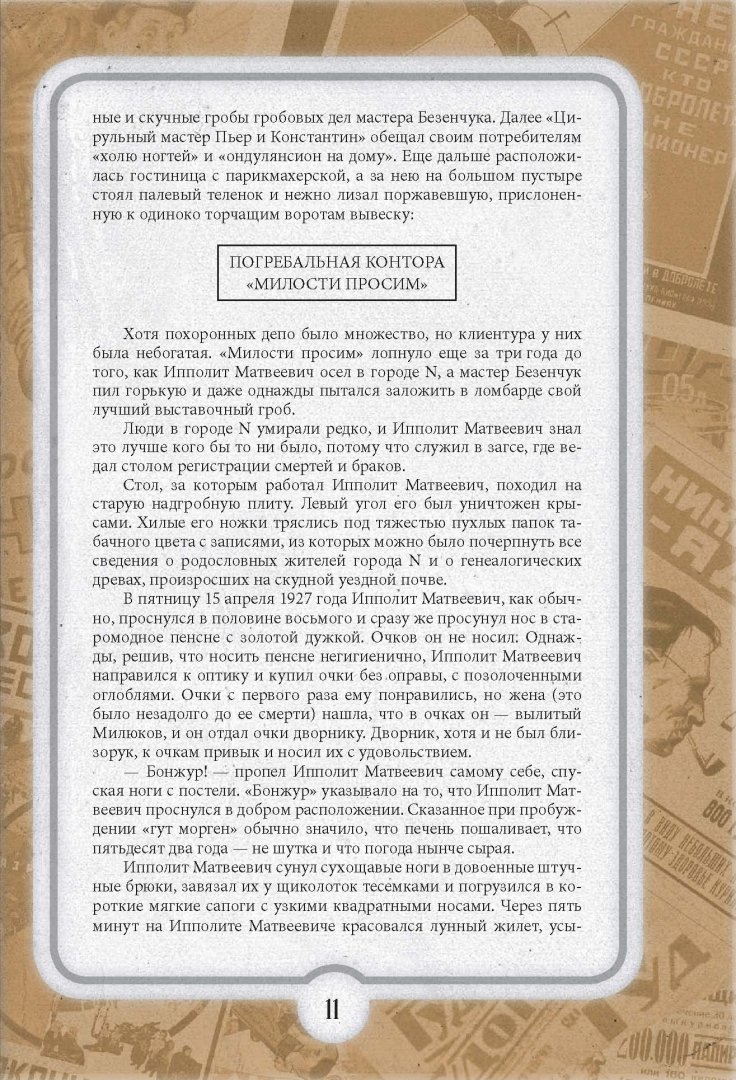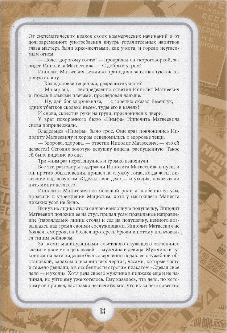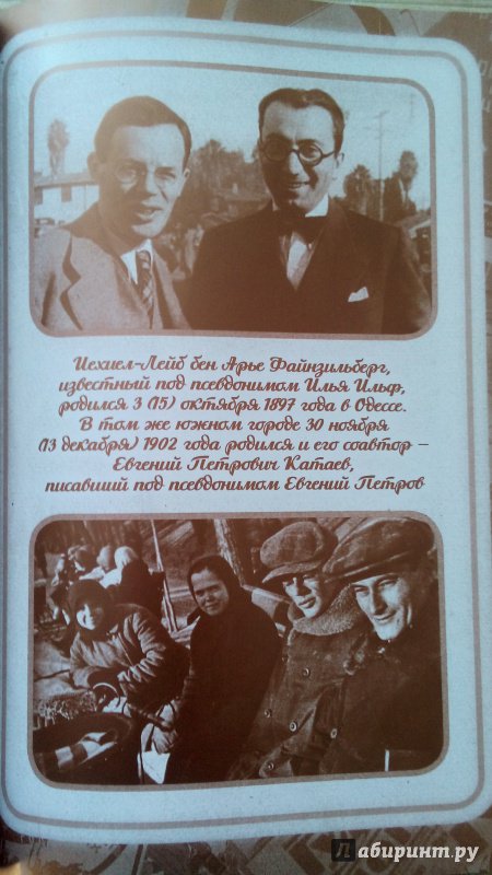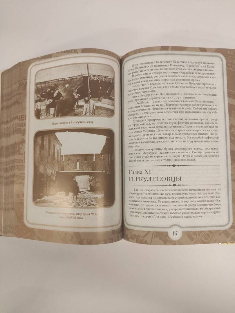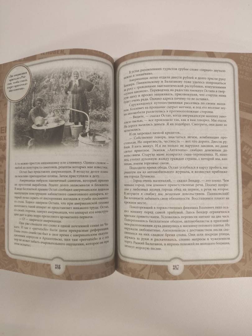 ОписаниеВы читали романы "Двенадцать стульев" и "Золотой теленок"? Любой человек скажет: "Конечно, читал!" Мы скажем: "Конечно, не читали!" Потому что в изданиях советских времен романы представлены в том виде, в каком их "разрешили" редакторы и советская цензура.В новом коллекционном издании бессмертные произведения Ильи Ильфа и Евгения Петрова о "великом комбинаторе" Остапе Бендере воспроизведены в авторской редакции, восстановленной Александрой Ильиничной Ильф. В тексты романов возвращены фрагменты, опубликованные в их первых изданиях, а также включен ряд материалов из рукописного и машинописного вариантов произведений.Благодаря великолепным фотоработам Ильи Ильфа и других уникальных фотохудожников книга перенесет вас в атмосферу старой России и старой Москвы, в те времена, когда разворачиваются события романов, в 20-30-е годы прошлого столетия.Вы читали романы "Двенадцать стульев" и "Золотой теленок"? Любой человек скажет: "Конечно, читал!" Мы скажем: "Конечно, не читали!" Потому что в изданиях советских времен романы представлены в том виде, в каком их "разрешили" редакторы и советская цензура.В новом коллекционном издании бессмертные произведения Ильи Ильфа и Евгения Петрова о "великом комбинаторе" Остапе Бендере воспроизведены в авторской редакции, восстановленной Александрой Ильиничной Ильф. В тексты романов возвращены фрагменты, опубликованные в их первых изданиях, а также включен ряд материалов из рукописного и машинописного вариантов произведений.Благодаря великолепным фотоработам Ильи Ильфа и других уникальных фотохудожников книга перенесет вас в атмосферу старой России и старой Москвы, в те времена, когда разворачиваются события романов, в 20-30-е годы прошлого столетия.