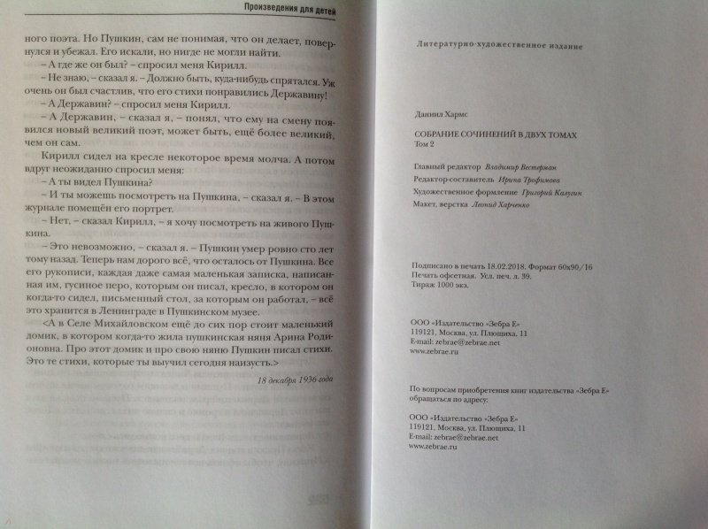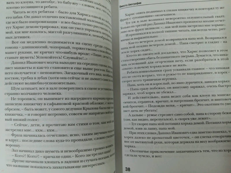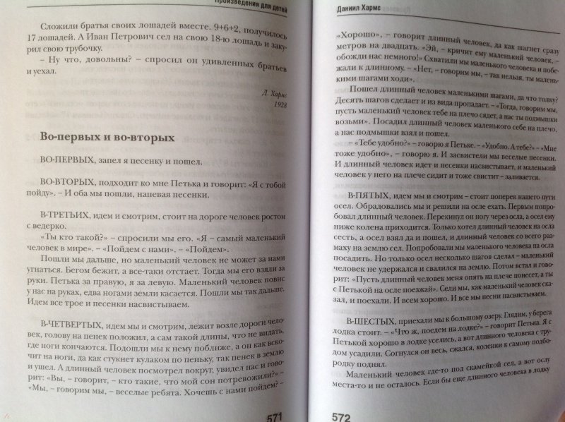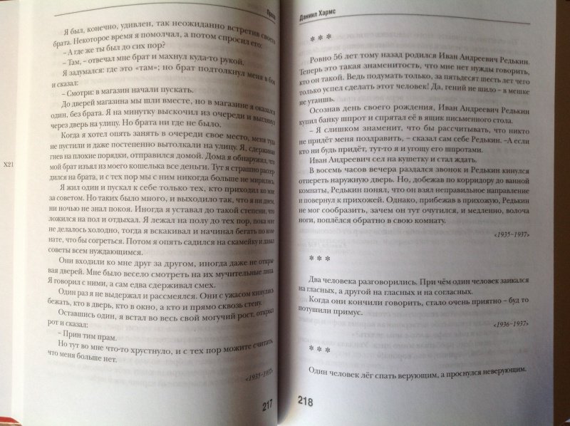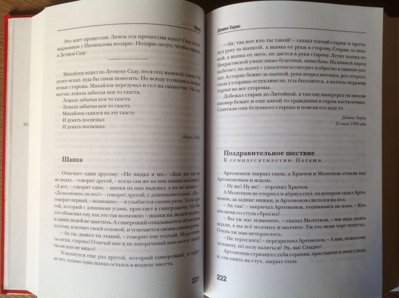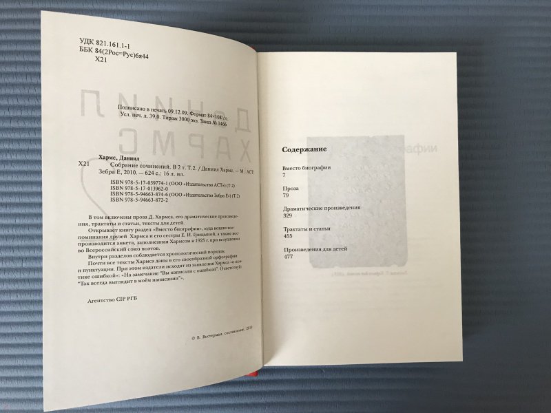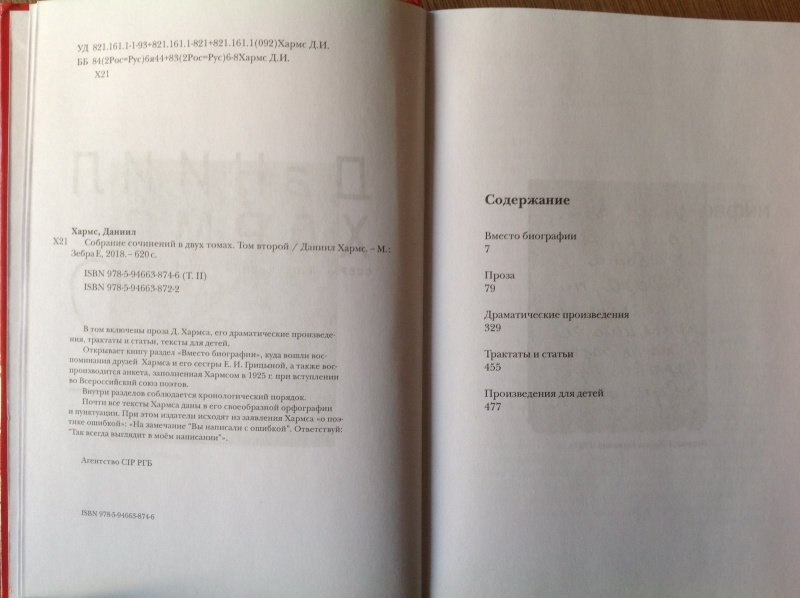 ОписаниеВ том включены проза Даниила Хармса, его драматические произведения, трактаты и статьи, тексты для детей. Открывает книгу раздел "Вместо биографии", куда вошли воспоминания друзей Хармса и его сестры Е.И.Грицыной, а также воспроизводится анкета, заполненная Хармсом в 1925 г. при вступлении во Всероссийский союз поэтов. Внутри разделов соблюдается хронологический порядок. Почти все тексты Хармса даны в его своеобразной орфографии и пунктуации. При этом издатели исходят из заявления Хармса "о поэтике ошибкой": "На замечание "Вы написали с ошибкой". Ответствуй: "Так всегда выглядит в моем написании"".В том включены проза Даниила Хармса, его драматические произведения, трактаты и статьи, тексты для детей. Открывает книгу раздел "Вместо биографии", куда вошли воспоминания друзей Хармса и его сестры Е.И.Грицыной, а также воспроизводится анкета, заполненная Хармсом в 1925 г. при вступлении во Всероссийский союз поэтов. Внутри разделов соблюдается хронологический порядок. Почти все тексты Хармса даны в его своеобразной орфографии и пунктуации. При этом издатели исходят из заявления Хармса "о поэтике ошибкой": "На замечание "Вы написали с ошибкой". Ответствуй: "Так всегда выглядит в моем написании"".