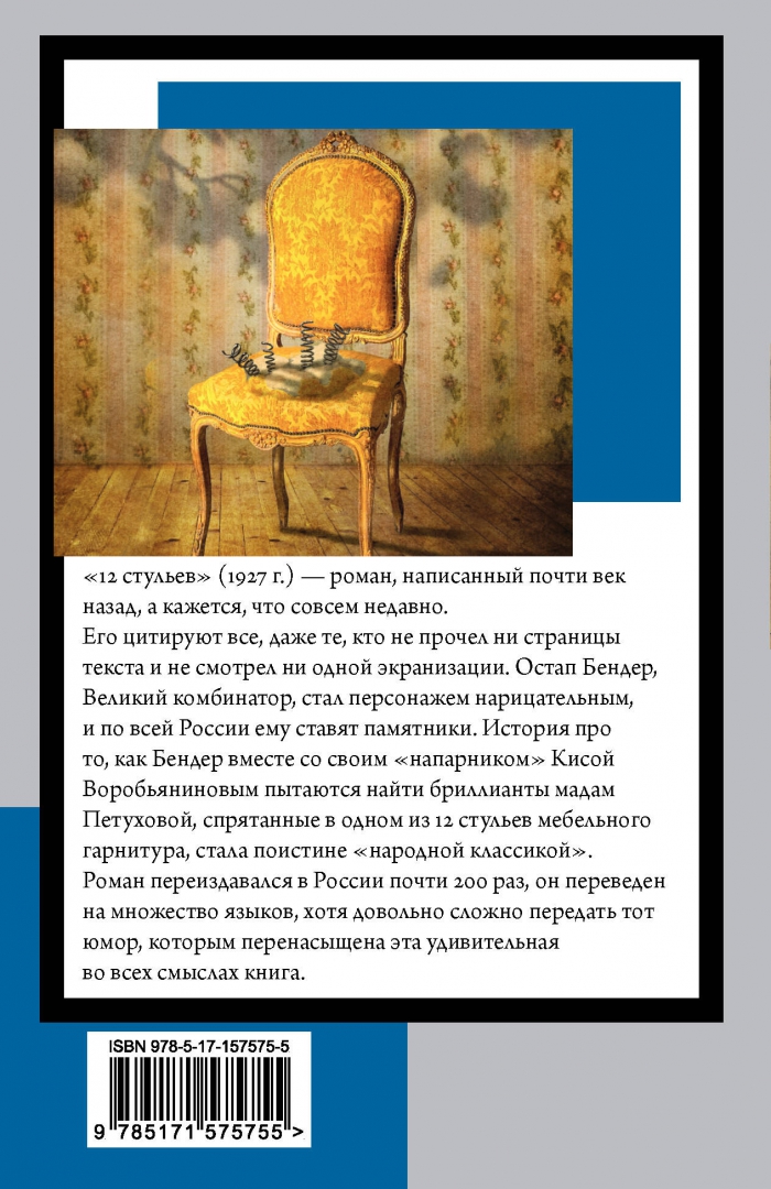 Описание"12 стульев" (1927 г.) — роман, написанный почти век назад, а кажется, что совсем недавно. Его цитируют все, даже те, кто не прочел ни страницы текста и не смотрел ни одной экранизации. Остап Бендер, Великий комбинатор, стал персонажем нарицательным, и по всей России ему ставят памятники. История про то, как Бендер вместе со своим "напарником" Кисой Воробьяниновым пытаются найти бриллианты мадам Петуховой, спрятанные в одном из 12 стульев мебельного гарнитура, стала поистине "народной классикой".Роман переиздавался в России почти 200 раз, он переведен на множество языков, хотя довольно сложно передать тот юмор, которым перенасыщена эта удивительная во всех смыслах книга.Ипполит Матвеевич Воробьянинов узнает от умирающей тещи, что в одном из двенадцати стульев семейного гарнитура спрятаны дореволюционные фамильные драгоценности. Следы сокровища приводят его в Старгород, где он знакомится с «великим комбинатором» Остапом Бендером, вместе с которым он отправляется в большое путешествие по всему Советскому Союзу в поисках бриллиантов мадам Петуховой.